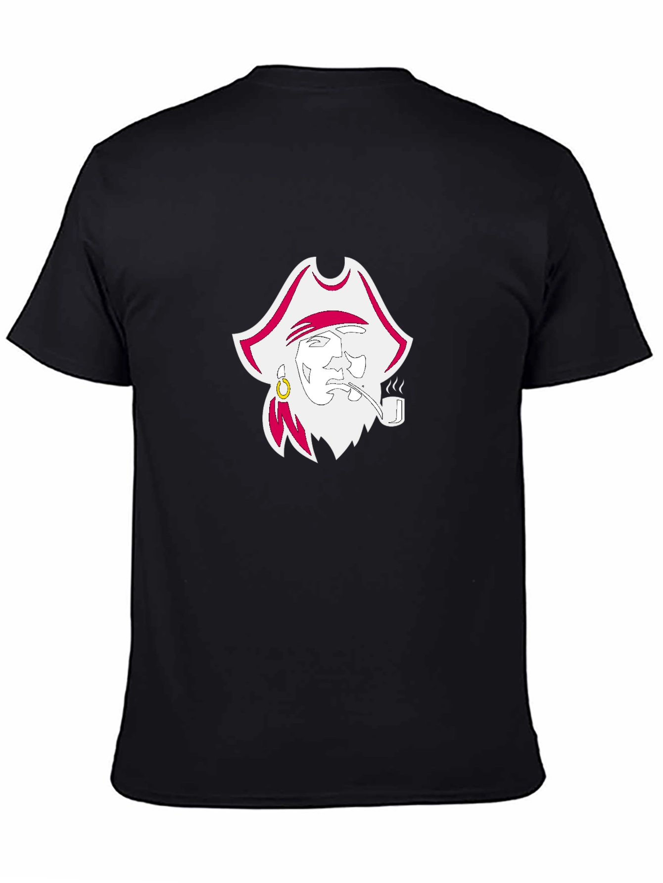 Show off your love for pirates with this stylish black tee! The shirt features a prominent pirate logo with a distinctive red and white color scheme. The pirate head is displayed with a jaunty hat, eye patch, gold earring, and smoking a pipe. This design gives it a vintage and cool look. The shirt is made of a comfortable material, perfect for casual wear or a themed party. Stand out and make a statement with this one-of-a-kind pirate tee. Get yours today!