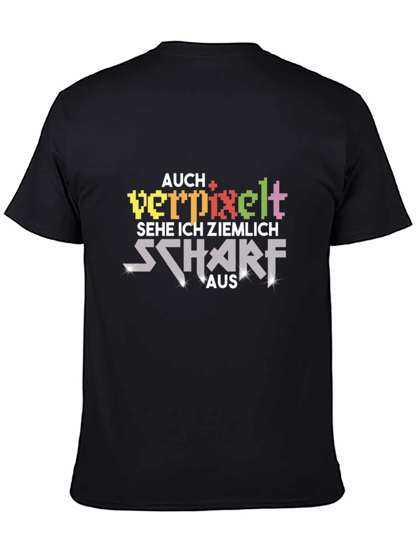 Stand out with this unique black t-shirt featuring a pixelated design! The vibrant colors of the 'verpixelt' text contrasted with the metallic 'SCHARF' create a striking visual effect. Made from a comfortable, breathable fabric, this tee is perfect for casual wear or gaming events. Show off your love for retro gaming and modern style with this eye-catching piece. Ideal for gamers, tech enthusiasts, or anyone who appreciates a bold statement. This is a must-have addition to your wardrobe! It's also a great gift idea for friends and family.