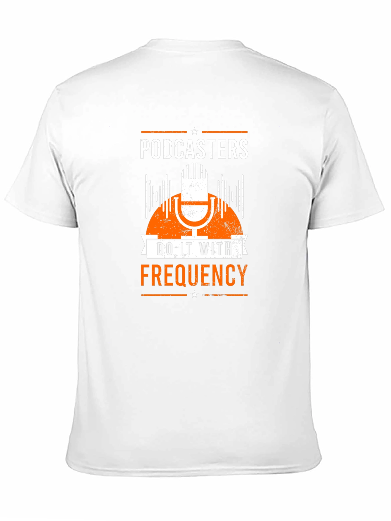 This black t-shirt features a bold graphic design that celebrates podcasting. The design includes a vintage-style microphone at the center, surrounded by audio wave-like bars. Above the design, the word "PODCASTERS" is printed in a clean, sans-serif font, with the phrase "DO-IT WITH FREQUENCY" displayed below in a banner style. The lettering and design elements are in a contrasting orange color, adding visual interest and a retro feel. Made from a soft, breathable fabric, this tee is perfect for everyday wear or as a conversation starter for podcast enthusiasts. Show off your passion for podcasting with this unique tee!