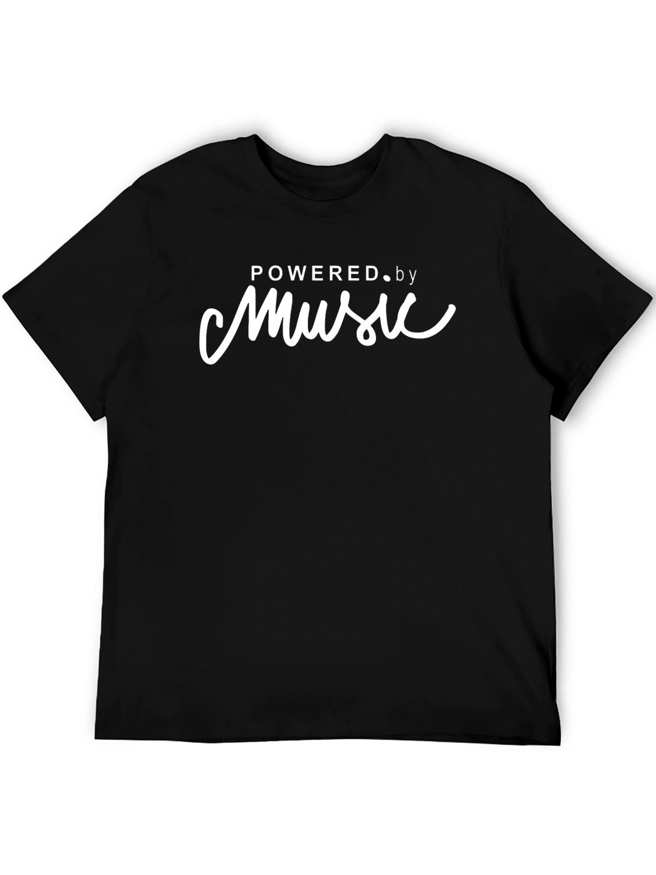 Show off your love for music with this stylish black t-shirt. The shirt features a bold, white graphic that reads "POWERED . by music". Made from a soft and comfortable fabric, this shirt is perfect for everyday wear. Its classic fit makes it suitable for any casual occasion. Ideal for music lovers, concerts, or simply expressing your passion. Make a statement and let everyone know what fuels your soul. This shirt is a must-have addition to your wardrobe.