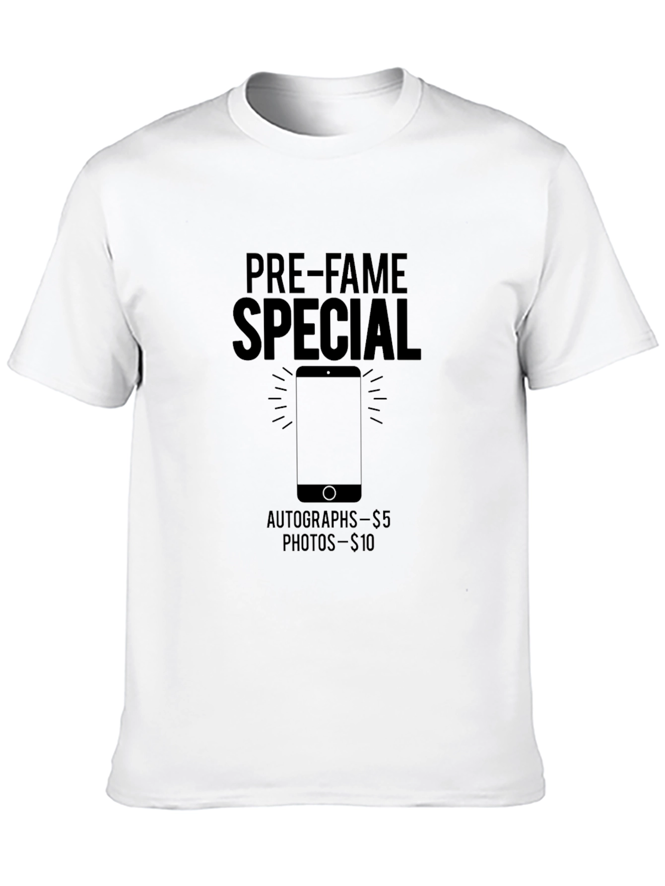 This classic black t-shirt features a humorous and eye-catching graphic. "Pre-Fame Special" is printed in bold lettering across the chest, accompanied by a stylized illustration of a smartphone. Below the phone graphic, it reads "Autographs - $5, Photos - $10", adding a playful touch. This tee is made from soft, comfortable fabric, perfect for casual wear. Show off your sense of humor with this quirky and unique shirt. Ideal for everyday use or as a conversation starter at social gatherings. A must-have addition to any wardrobe!