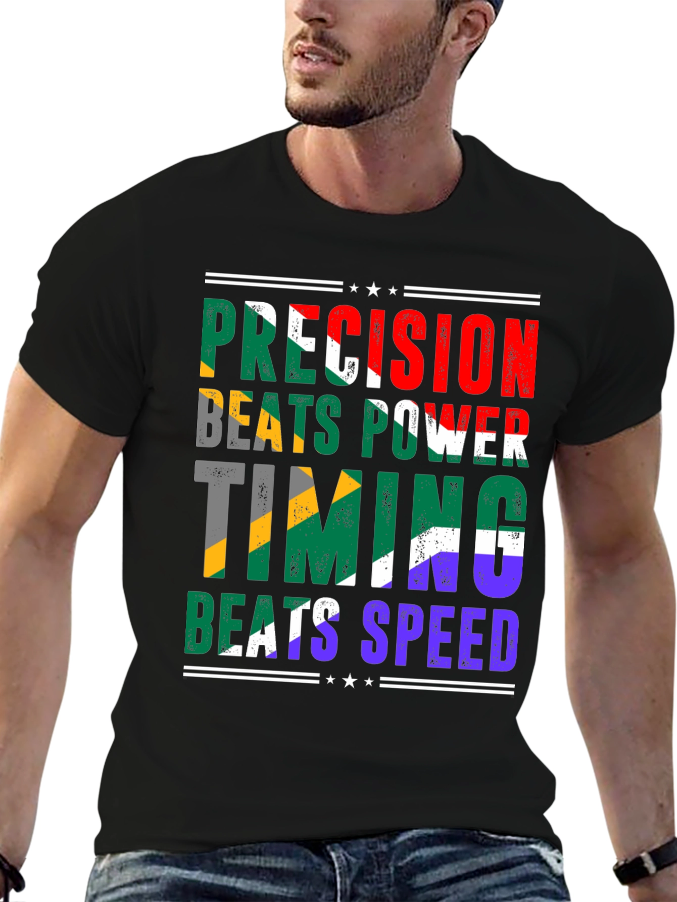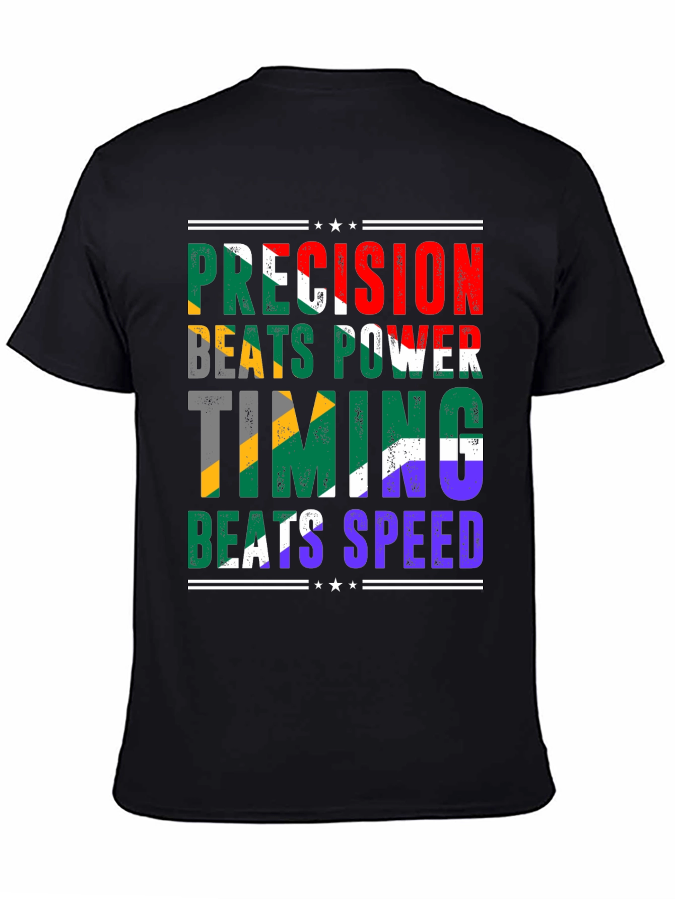 Showcase your unique style with this eye-catching black t-shirt. The design features the bold statement "Precision Beats Power, Timing Beats Speed" in a distressed, multi-colored print that adds a vintage touch. The colors of the design provide a striking visual appeal. Made from a comfortable and durable fabric, this tee is perfect for everyday wear. Pair it with jeans, shorts, or joggers for a casual yet fashionable look. Whether you're heading to the gym, hanging out with friends, or simply relaxing at home, this t-shirt is sure to make a statement and express your individuality.