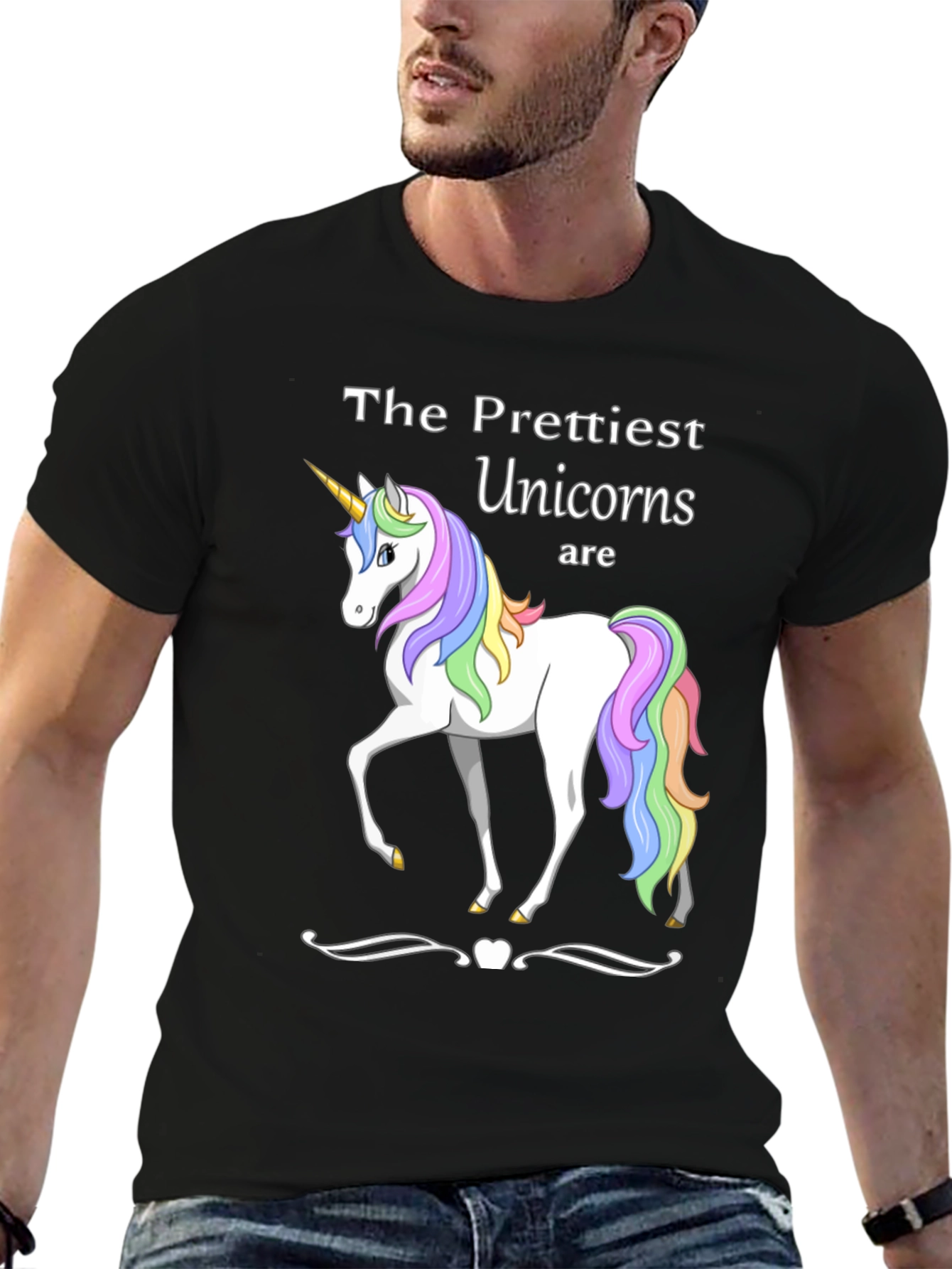 This stylish black t-shirt features a delightful graphic of a white unicorn with a rainbow-colored mane and tail. The design also includes the text "The Prettiest Unicorns are" above the unicorn image. Made from a comfortable-looking cotton blend fabric, this tee is perfect for casual wear. The design will appeal to unicorn lovers of all ages. Pair it with jeans, shorts, or a skirt for a fun and whimsical outfit. Great for everyday wear, parties, or as a gift for someone special who adores unicorns!
