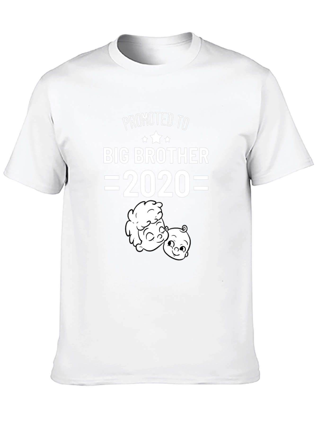 Celebrate becoming a big brother with this charming black t-shirt. The design features the words "Promoted to Big Brother" above two cute cartoon faces, presumably depicting the older and younger sibling. The year "2020" is prominently displayed, making it a memorable keepsake for that special year. This shirt is perfect for announcing the arrival of a new family member or as a fun and stylish way for a child to show off their big brother status. Made from comfortable and durable fabric, this shirt is ideal for everyday wear and will surely become a favorite in any young boy's wardrobe.
