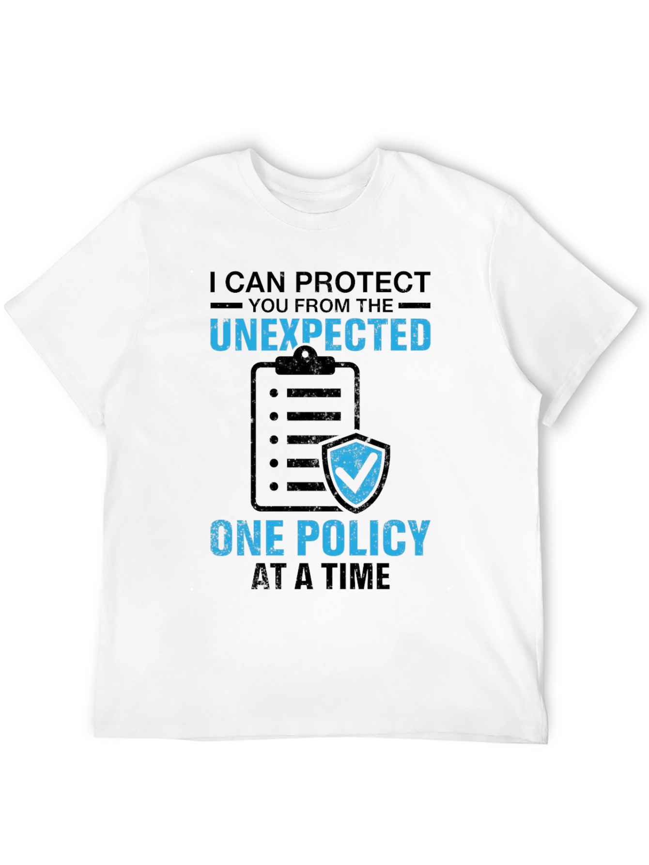 This black t-shirt features a unique design for insurance professionals. The graphic includes a clipboard with a checklist and a shield with a checkmark, symbolizing protection and policy enforcement. Bold blue text reads 'I CAN PROTECT YOU FROM THE UNEXPECTED - ONE POLICY AT A TIME.' The distressed font adds a vintage touch. Made from a comfortable material, this shirt is perfect for casual wear, work events, or as a conversation starter. Show your passion for insurance with this distinctive tee!