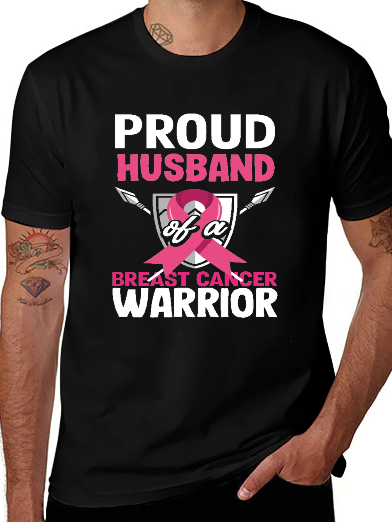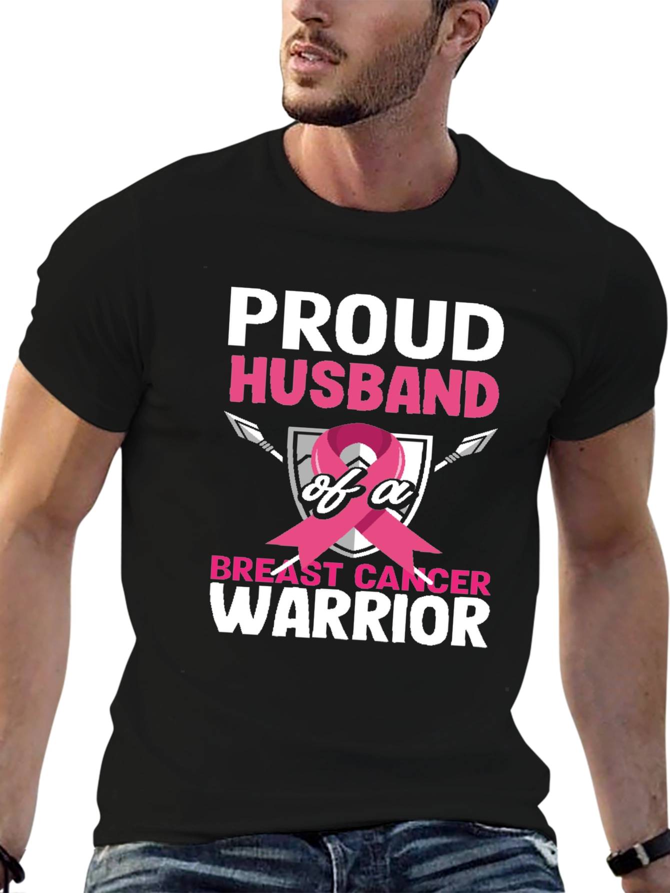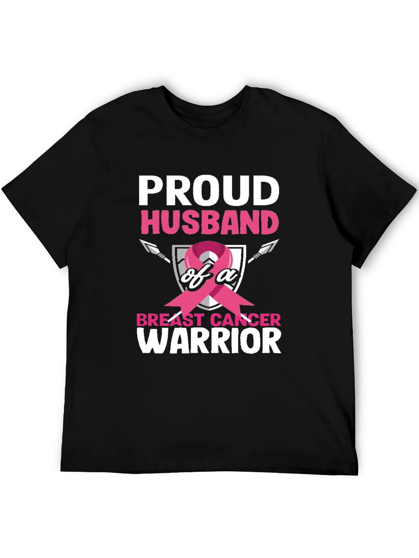 Show your support with this meaningful black t-shirt. The design features the text "PROUD HUSBAND of a BREAST CANCER WARRIOR" in bold, eye-catching fonts. A pink ribbon, symbolizing breast cancer awareness, is incorporated into the design, along with decorative spears and a shield. Perfect for raising awareness and showing solidarity. Made with comfortable materials for everyday wear. This shirt is ideal for walks, fundraising events, or as a thoughtful gift for a supportive spouse. Wear it with pride and demonstrate your commitment to fighting breast cancer. Get yours today and join the cause!