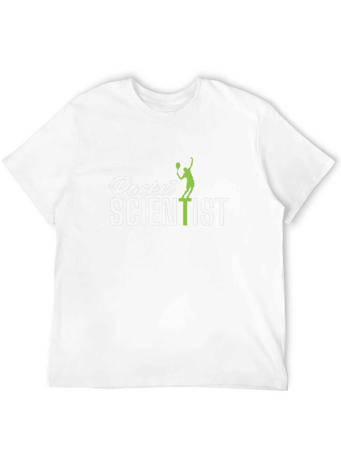 Show off your love for science and racket sports with this eye-catching black t-shirt. Featuring a clever graphic that reads "Racket Scientist," with a tennis player silhouette replacing the "T" in "Scientist", this tee is perfect for athletes, science enthusiasts, and anyone who appreciates a good pun. The design is printed in crisp white and green, offering a striking contrast against the black background. Made from a comfortable, breathable fabric, this shirt is ideal for everyday wear, workouts, or casual outings. It's a fun and unique way to express your interests and spark conversations wherever you go.