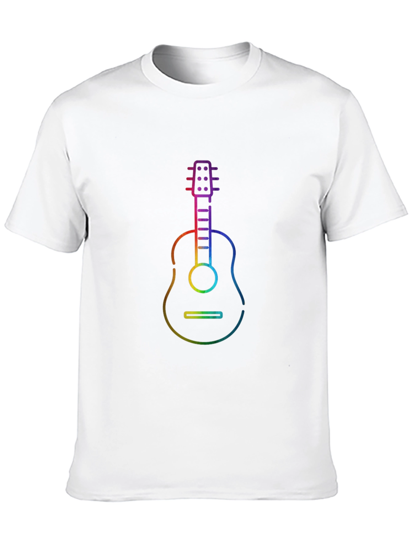 Rock your style with this eye-catching black t-shirt featuring a vibrant, rainbow-colored guitar graphic. The design is a stylish outline of an acoustic guitar, perfect for music lovers and those who appreciate unique apparel. Made from comfortable material, this tee offers a relaxed fit suitable for everyday wear. Show off your passion for music, whether you're heading to a concert, jamming with friends, or just looking to add some flair to your casual wardrobe. This shirt is sure to become a favorite!