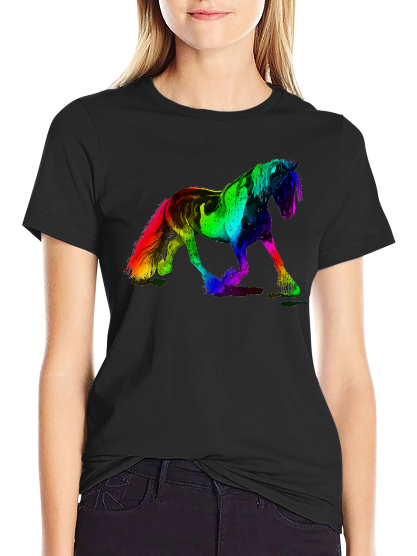 This stylish black t-shirt features a vibrant, colorful rainbow horse graphic. The eye-catching design is sure to make a statement. Made from comfortable, breathable fabric, this tee is perfect for casual wear, concerts, or any occasion where you want to showcase your unique style. The crew neck and short sleeves offer a classic fit for both men and women. Add a touch of whimsical art to your wardrobe with this distinctive and comfortable t-shirt. Great for horse lovers!