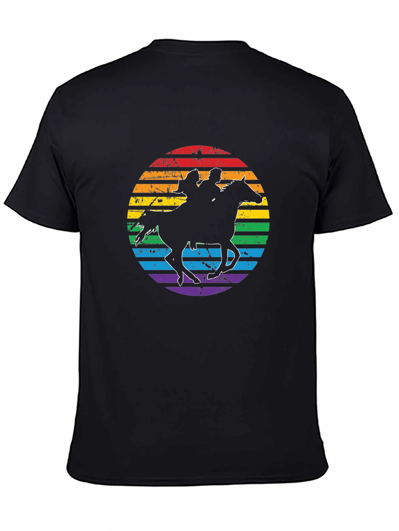 Show your pride with this stylish black t-shirt featuring a rainbow-striped sunset design. The silhouette of a horse and two riders adds a touch of equestrian flair. Made from a comfortable and durable fabric, this tee is perfect for casual wear, whether you're hitting the town or relaxing at home. The eye-catching graphic will make a statement wherever you go. Pair it with jeans or shorts for a versatile look. A unique addition to any wardrobe!