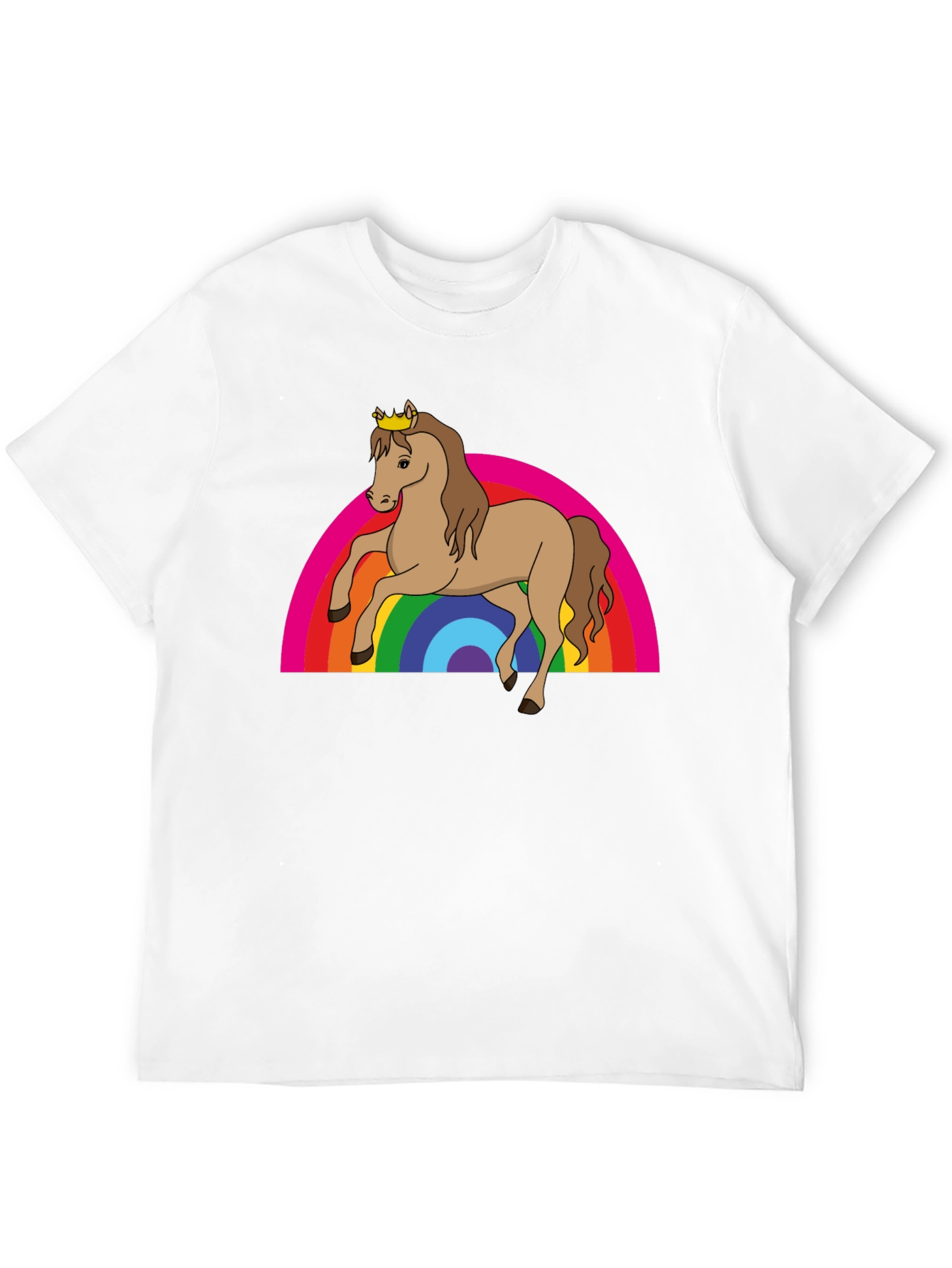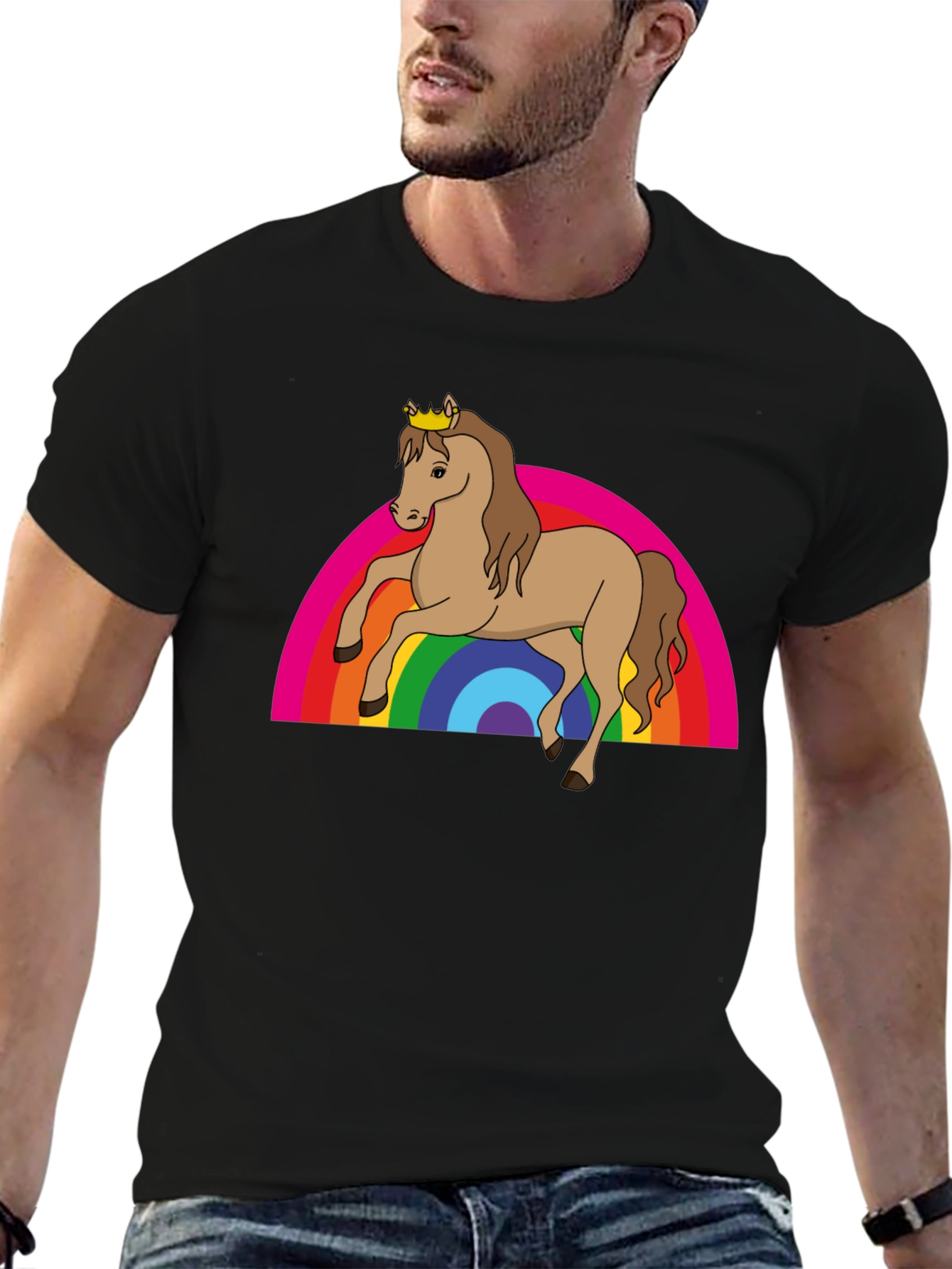 Add a touch of whimsy to your wardrobe with this charming graphic tee. The shirt features a delightful design of a brown horse wearing a golden crown, prancing across a vibrant rainbow. Made from comfortable, breathable fabric, this black t-shirt is perfect for everyday wear. Show off your love for fantasy and fun with this unique piece. Ideal for casual outings, themed parties, or simply expressing your playful side. This tee is sure to spark conversations and bring smiles wherever you go. Get yours today and let your imagination shine!