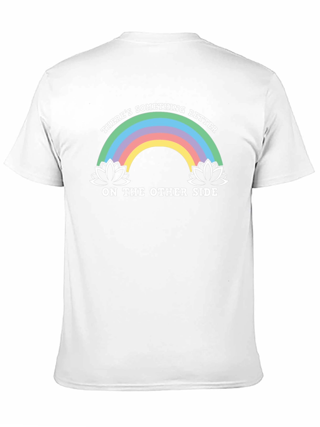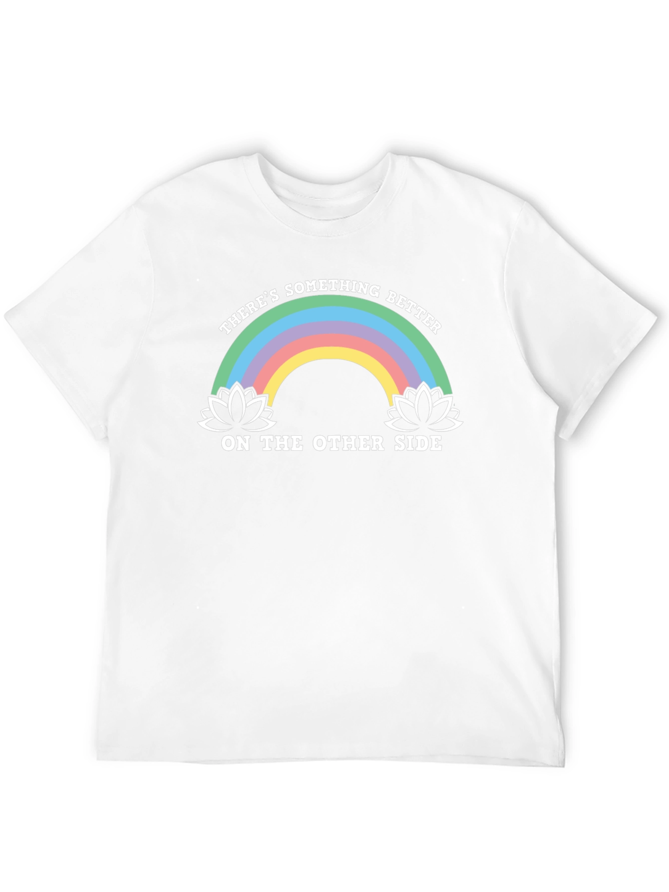 Embrace positivity with this stylish black t-shirt. Featuring a vibrant rainbow arc above the words "There's Something Better On The Other Side," flanked by elegant lotus flower designs. This comfortable tee is perfect for everyday wear, casual outings, or as a thoughtful gift. The soft fabric ensures a comfortable fit. Stand out with this unique and uplifting design. Spread good vibes and make a statement with this eye-catching t-shirt.