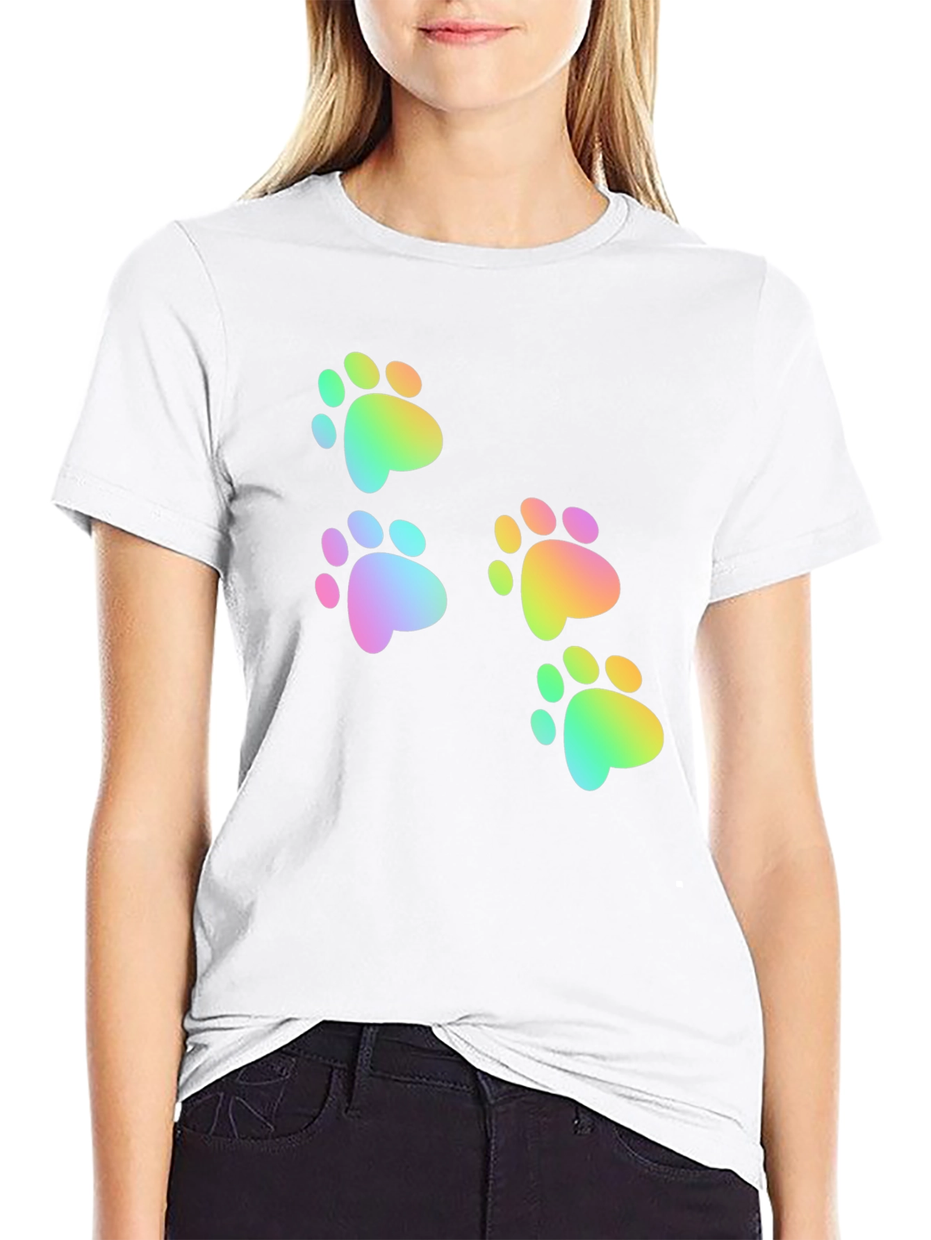 Show off your love for furry friends with this vibrant black T-shirt. Featuring a playful design of rainbow-colored paw prints, this tee adds a pop of color to any casual outfit. The soft, breathable fabric ensures all-day comfort, whether you're lounging at home or out for a stroll. Pair it with jeans or shorts for a fun, effortless look. Perfect for animal lovers who want to express their passion with style.