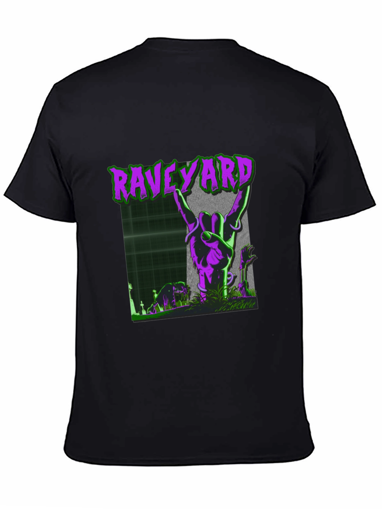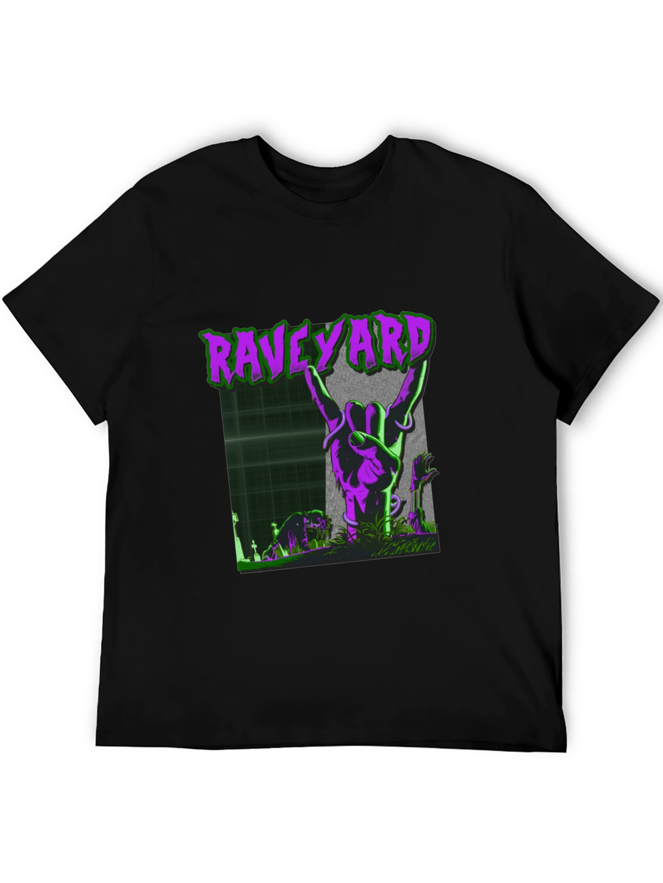 Rock out in style with this unique Raveyard graphic t-shirt. The black tee features a bold and vibrant design of a zombie hand making the rock-on sign, set against a graveyard backdrop with rave-inspired colors. Made from comfortable, breathable fabric, this shirt is perfect for concerts, parties, or casual everyday wear. Stand out from the crowd with this eye-catching tee that combines horror and music themes. Show off your edgy style and love for rock music with this must-have addition to your wardrobe. Great for ravers, rockers, or anyone who loves a unique graphic tee.