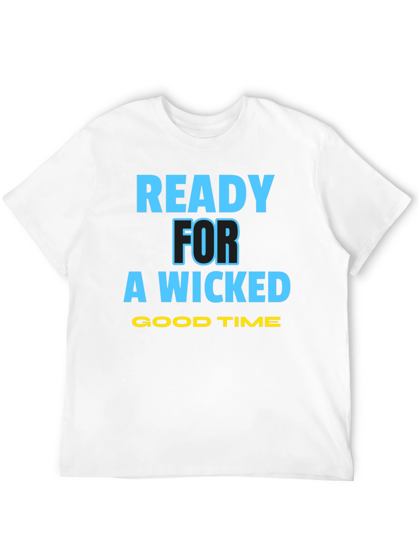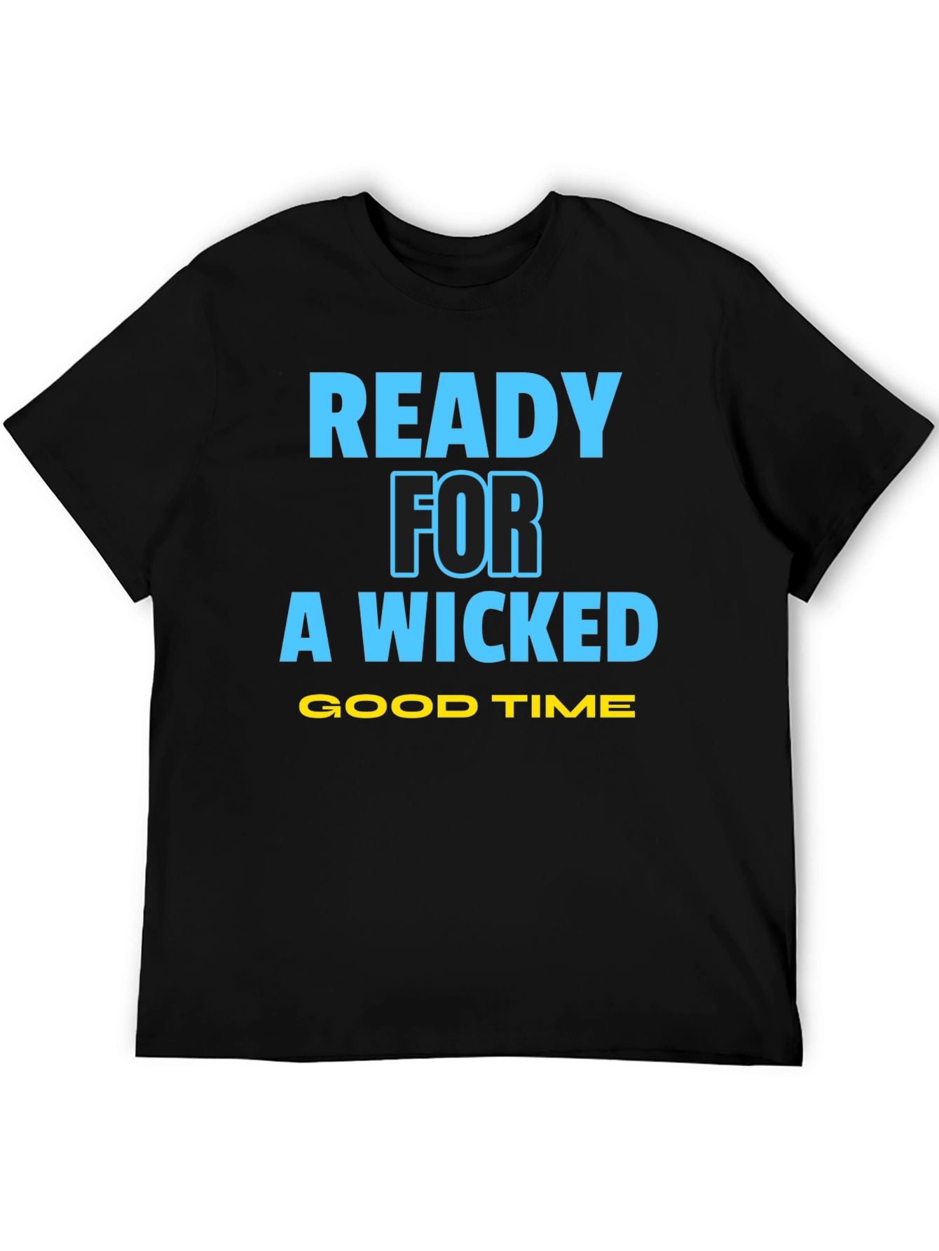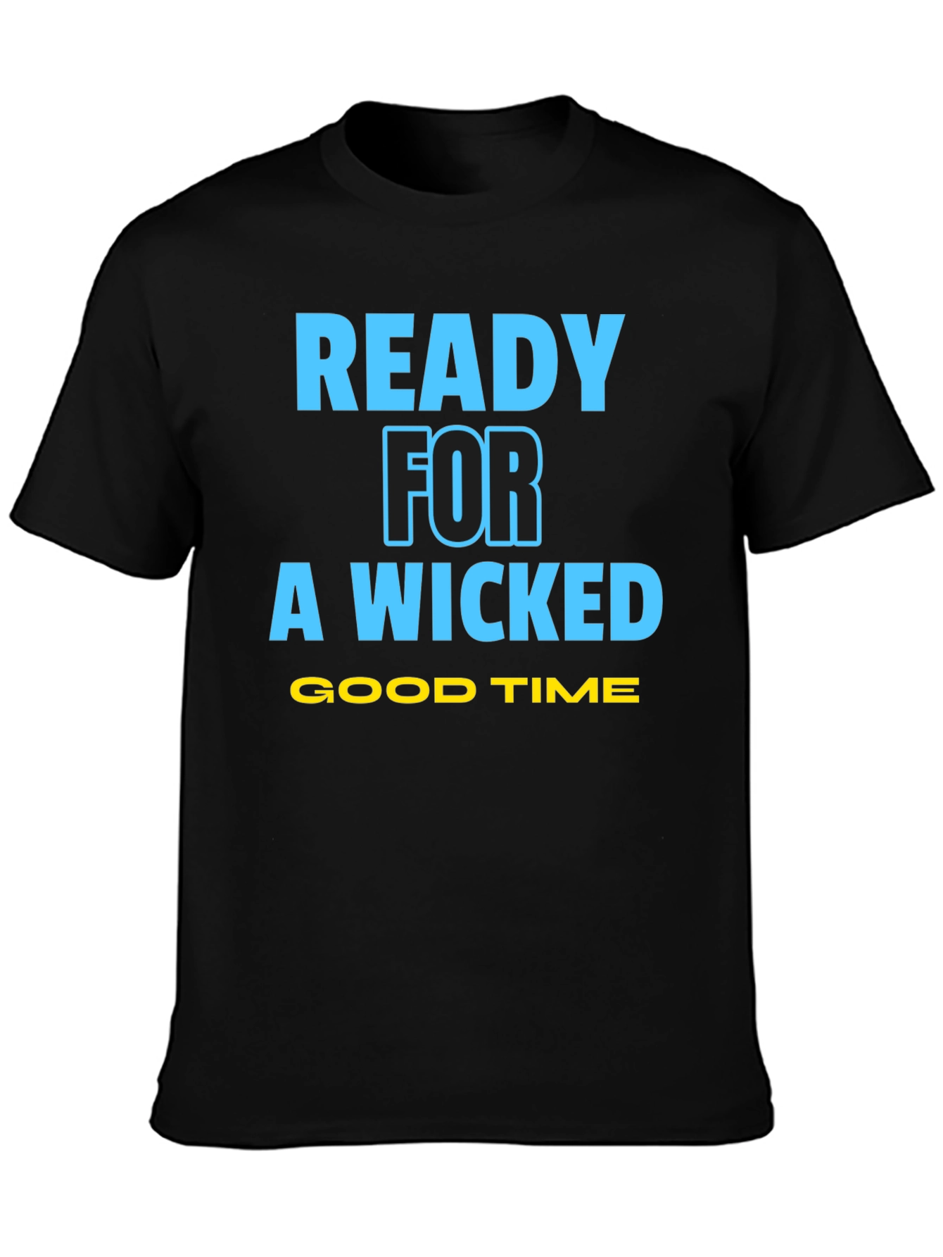 Get ready to have a blast with this eye-catching black t-shirt! The front features a bold, blue graphic that reads "READY FOR A WICKED" above a vibrant yellow "GOOD TIME." This tee is perfect for those who love to stand out and express their fun-loving side. Made from a comfortable-looking fabric, it's ideal for casual outings, parties, or just lounging around. Pair it with jeans or shorts for a relaxed yet stylish look. Show off your unique personality and make a statement wherever you go with this awesome t-shirt!