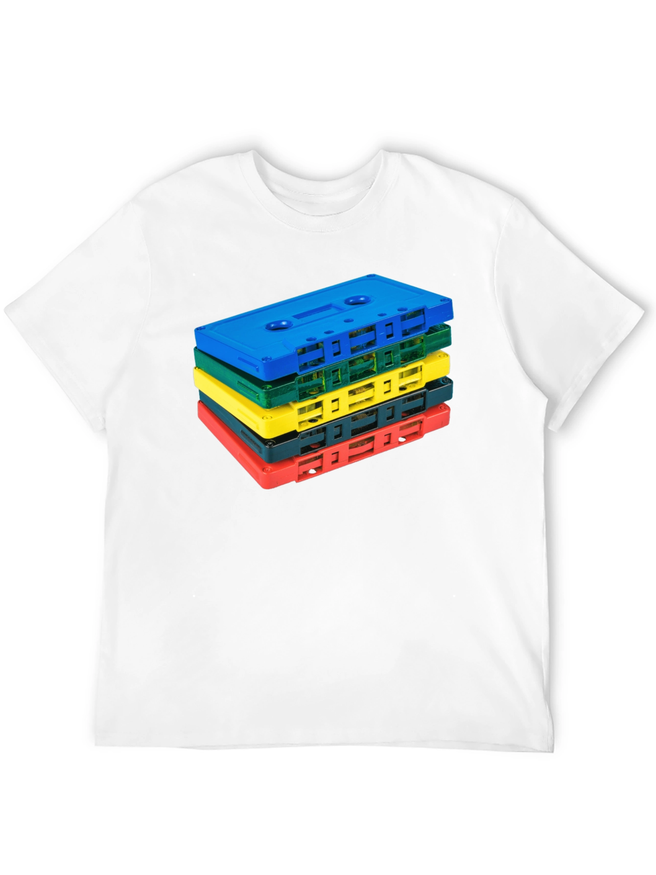 Rock a vintage vibe with this eye-catching graphic tee! The black t-shirt features a vibrant stack of cassette tapes in blue, green, yellow, and red, giving it a cool, retro aesthetic. Made from a soft, breathable fabric, this tee offers a comfortable fit for everyday wear. The bold cassette tape design adds a pop of color and personality to any outfit. Pair it with jeans and sneakers for a casual look, or dress it up with a jacket for a night out. Show off your love for classic music with this unique and stylish t-shirt.