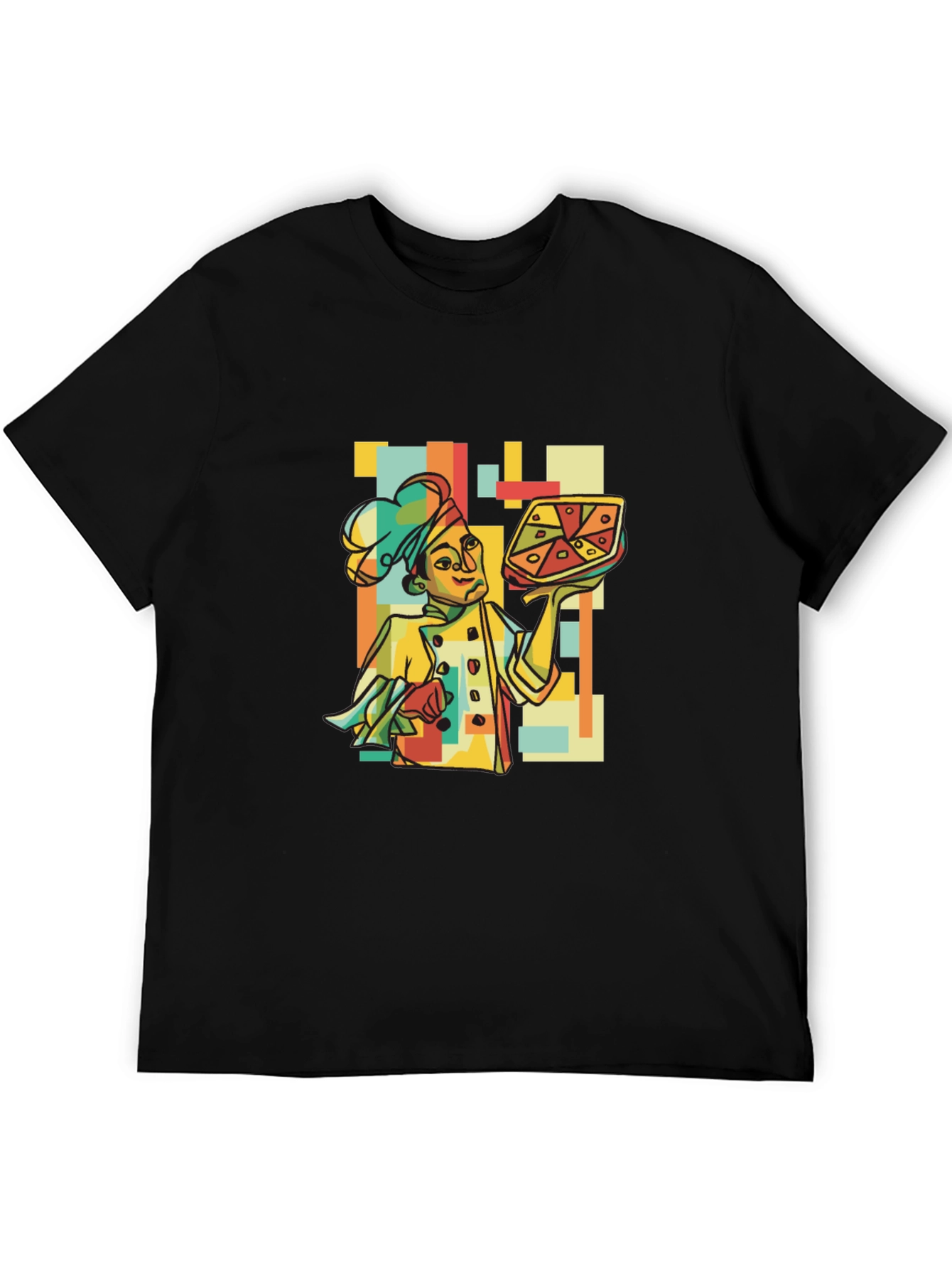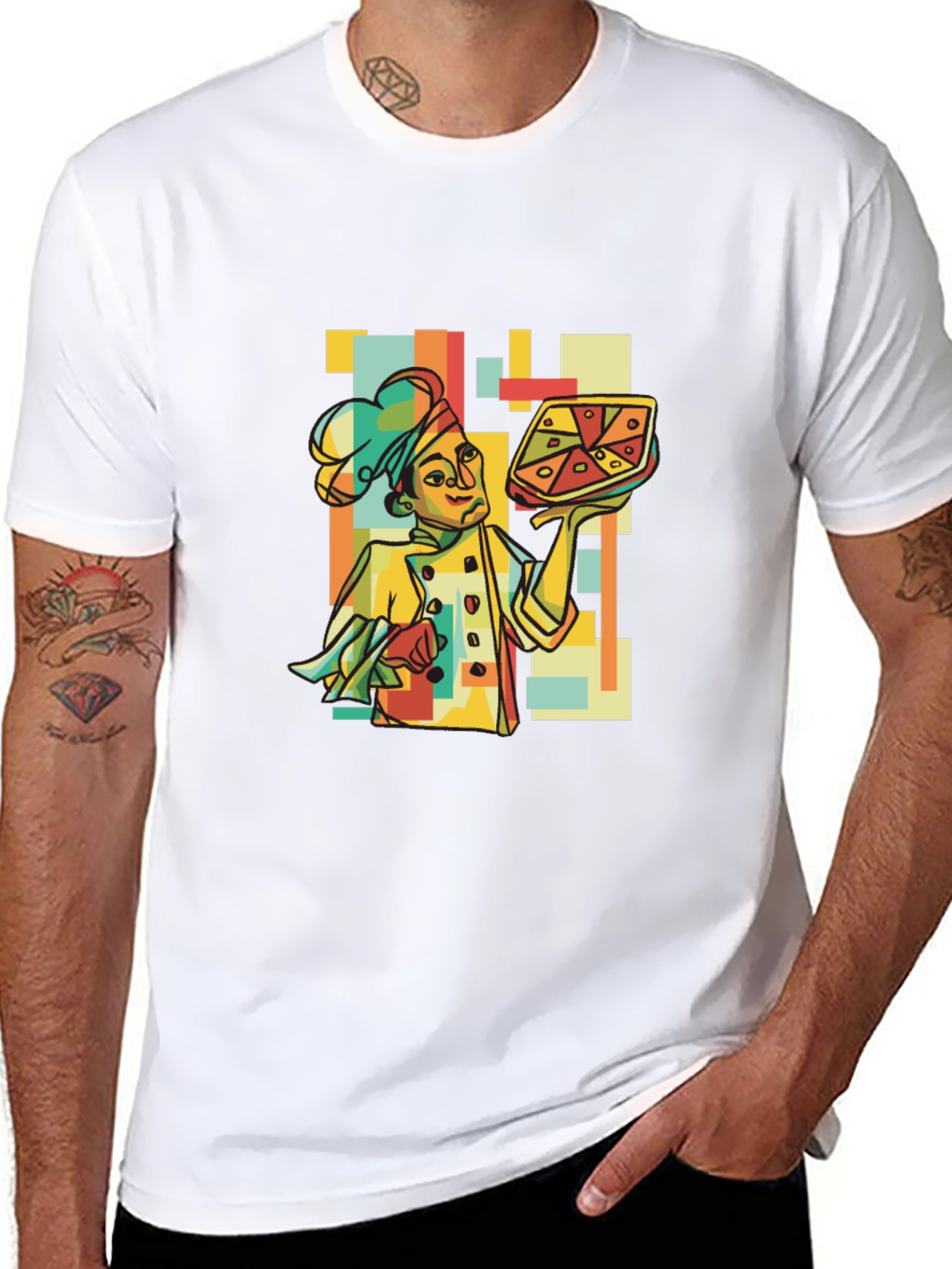 Serve up some style with this unique graphic t-shirt! Featuring a cartoon chef holding a colorful, retro-style pizza, this shirt is sure to turn heads. The design incorporates vibrant geometric shapes and a playful color palette, giving it a fun, vintage vibe. Made from comfortable, breathable fabric, this tee is perfect for casual wear. Show off your love for pizza and quirky fashion with this eye-catching piece. Ideal for pizza lovers, chefs, or anyone who appreciates a good conversation starter. Add a dash of flavor to your wardrobe today!