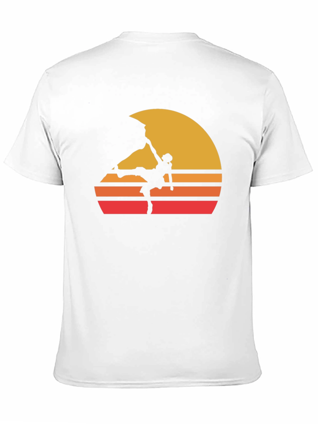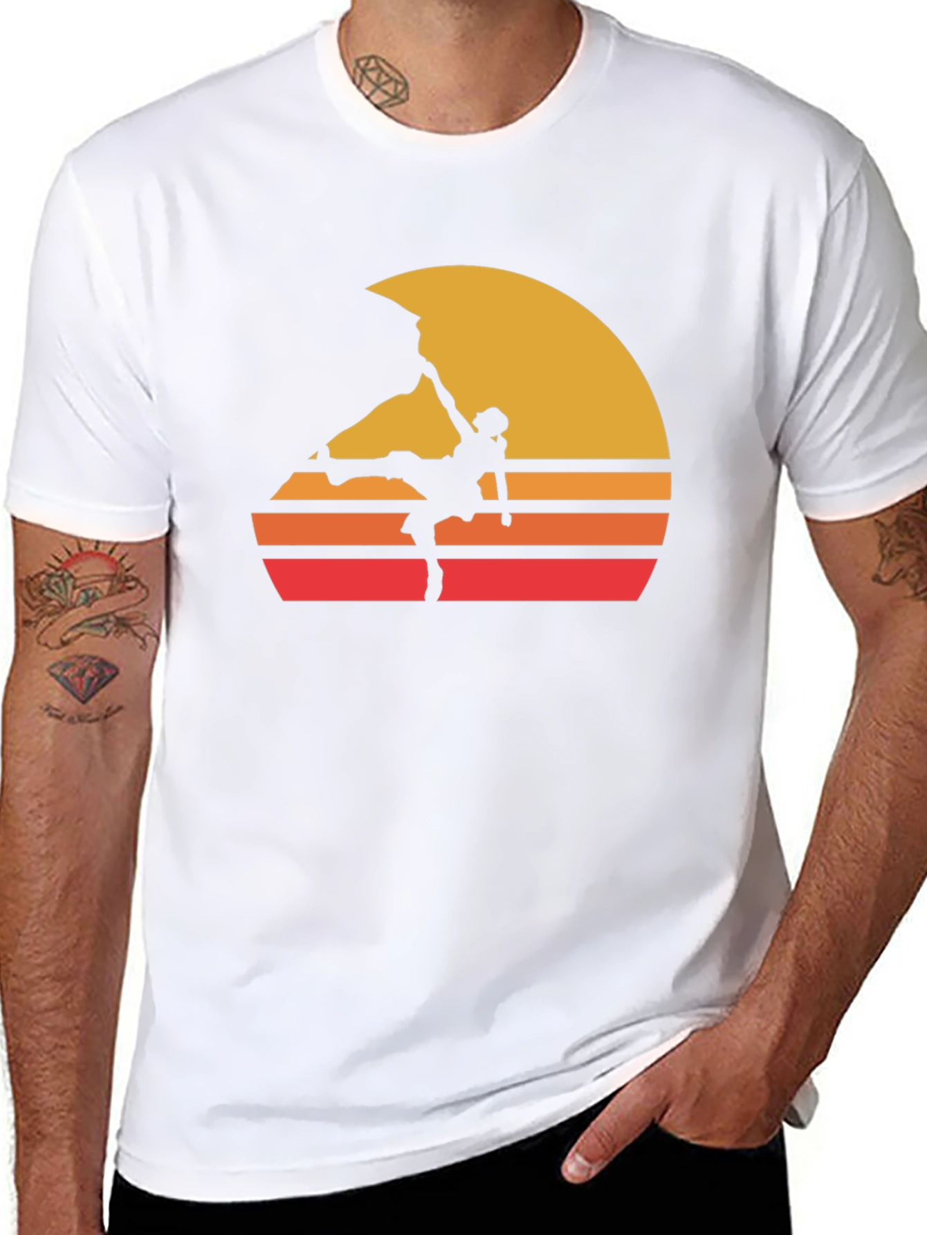Embrace your adventurous side with this classic black t-shirt featuring a striking retro-inspired graphic. The design showcases a silhouette of a climber against a vibrant sunset backdrop, blending hues of yellow, orange, and red. This short-sleeved tee is made from a soft, comfortable fabric that appears to be cotton or a cotton blend, making it ideal for everyday wear. Perfect for rock climbing enthusiasts or anyone who appreciates vintage aesthetics, this shirt adds a touch of bold style to any casual outfit. Wear it while hitting the gym, enjoying the outdoors, or simply hanging out with friends. Stand out with this unique and eye-catching statement piece.