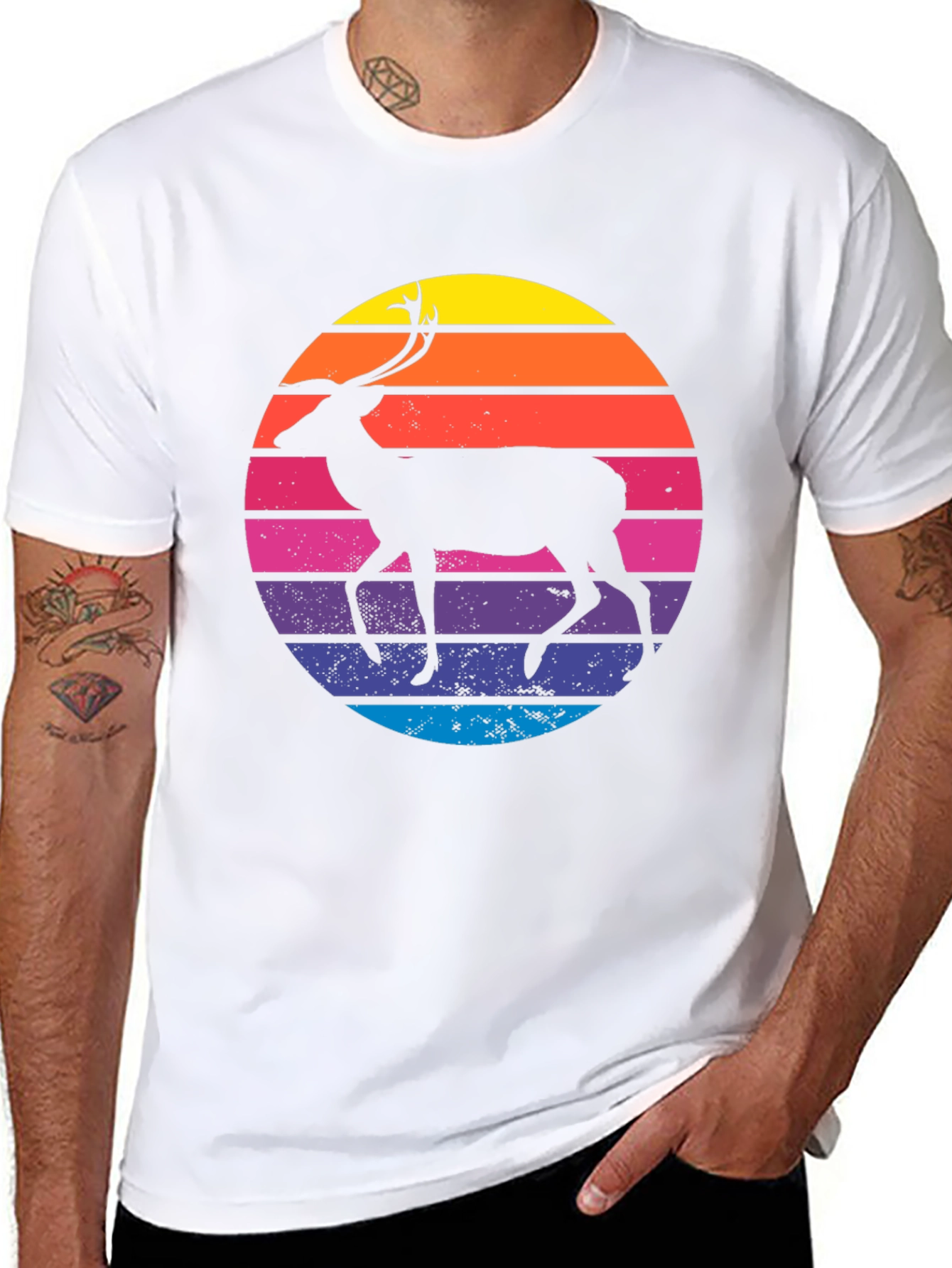 Show off your love for the outdoors with this stylish t-shirt. The design features a striking silhouette of a deer set against a retro-inspired sunset circle in vibrant colors. This unique tee is perfect for casual wear and making a statement. Constructed from a soft, comfortable fabric, this shirt is sure to be a go-to favorite. The vivid graphics and durable print ensure long-lasting wear and eye-catching appeal. Add this cool tee to your wardrobe for an effortlessly stylish look, great for everyday wear or outdoor adventures.