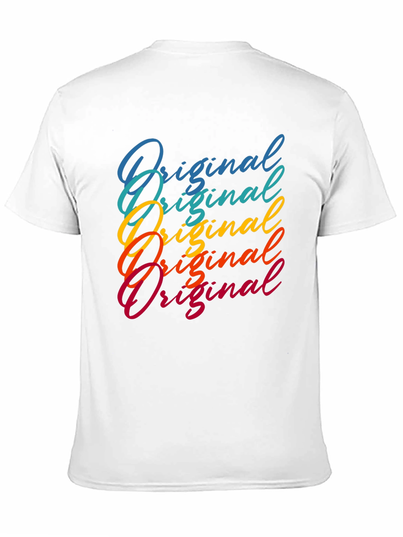 Show off your authentic style with this eye-catching black t-shirt. The shirt features a retro-inspired design with the word "Original" repeated in a stacked, gradient color scheme. The colors transition smoothly from blue to green, yellow, orange, and finally to red/pink, creating a vibrant visual effect. Made from a comfortable, breathable fabric, this tee is perfect for casual wear. Pair it with jeans or shorts for a relaxed yet stylish look. Ideal for expressing your unique personality and making a statement wherever you go. Add this original piece to your wardrobe!