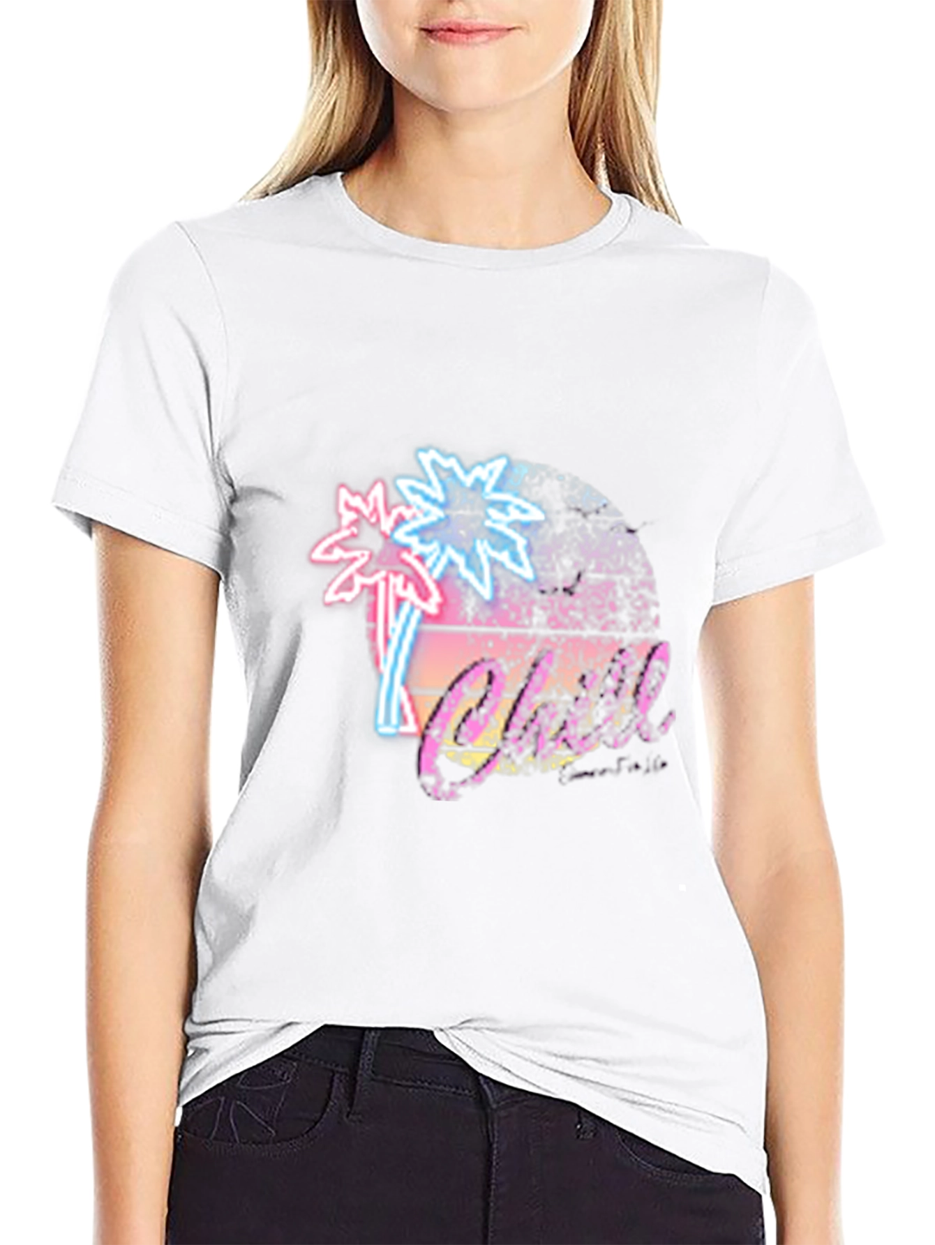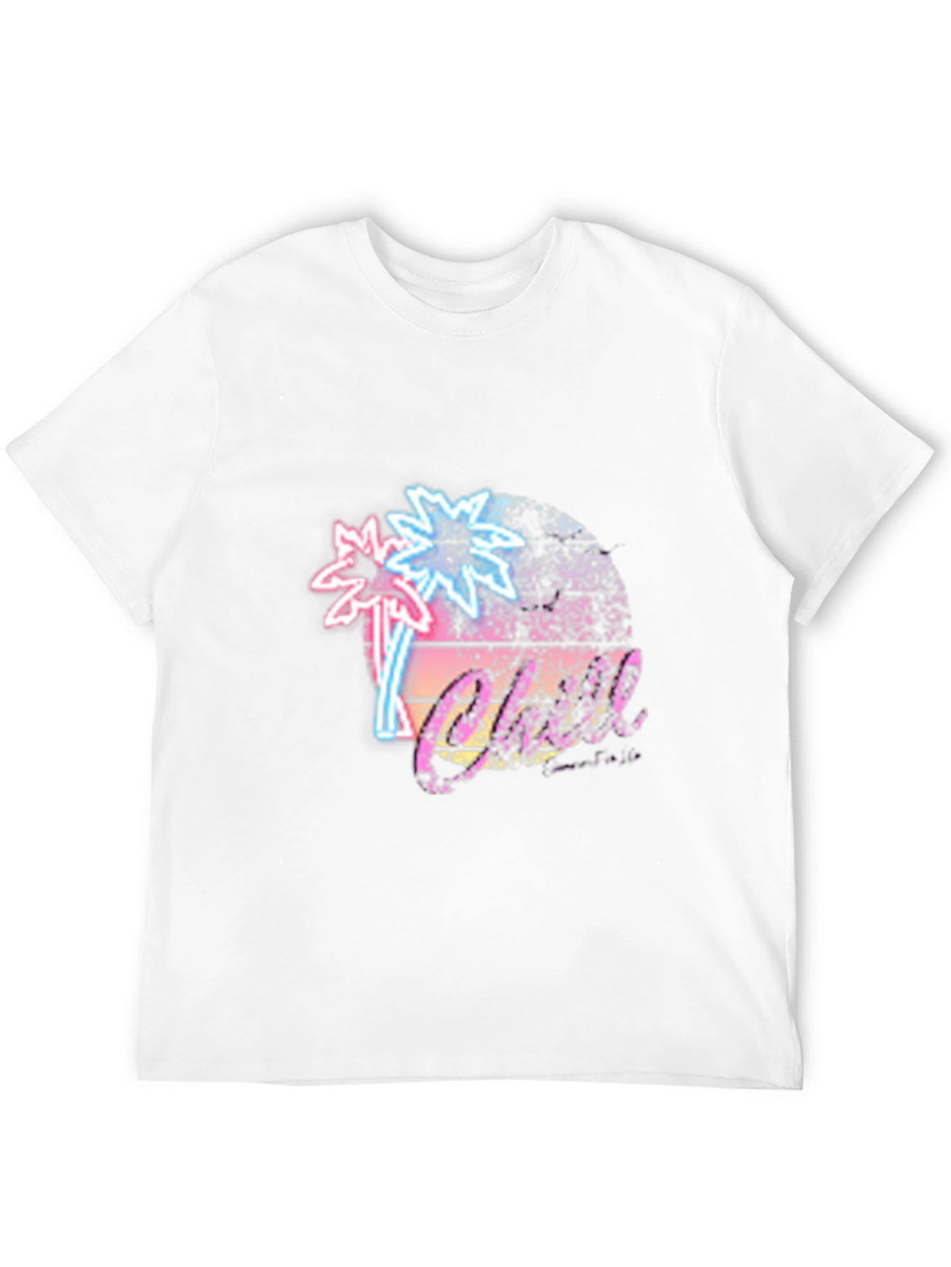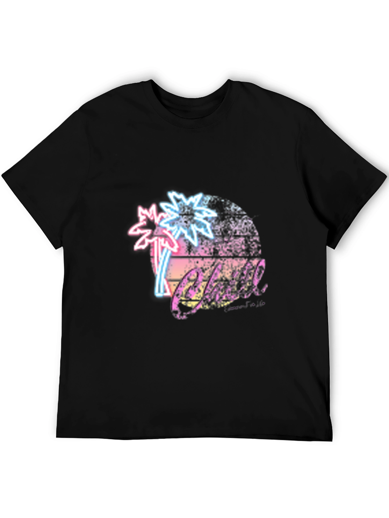Embrace a touch of nostalgia with this eye-catching black t-shirt. The design features a vibrant, retro-inspired graphic showcasing neon-style palm trees set against a stylized sun. The playful and colorful aesthetic evokes a sense of beachy fun. Crafted from comfortable materials, this tee is perfect for casual wear. It's a statement piece that will add a pop of color to your wardrobe. Wear it on a day out, at a casual get-together, or anytime you want to showcase a unique and trendy style. Its bold design ensures you stand out from the crowd.