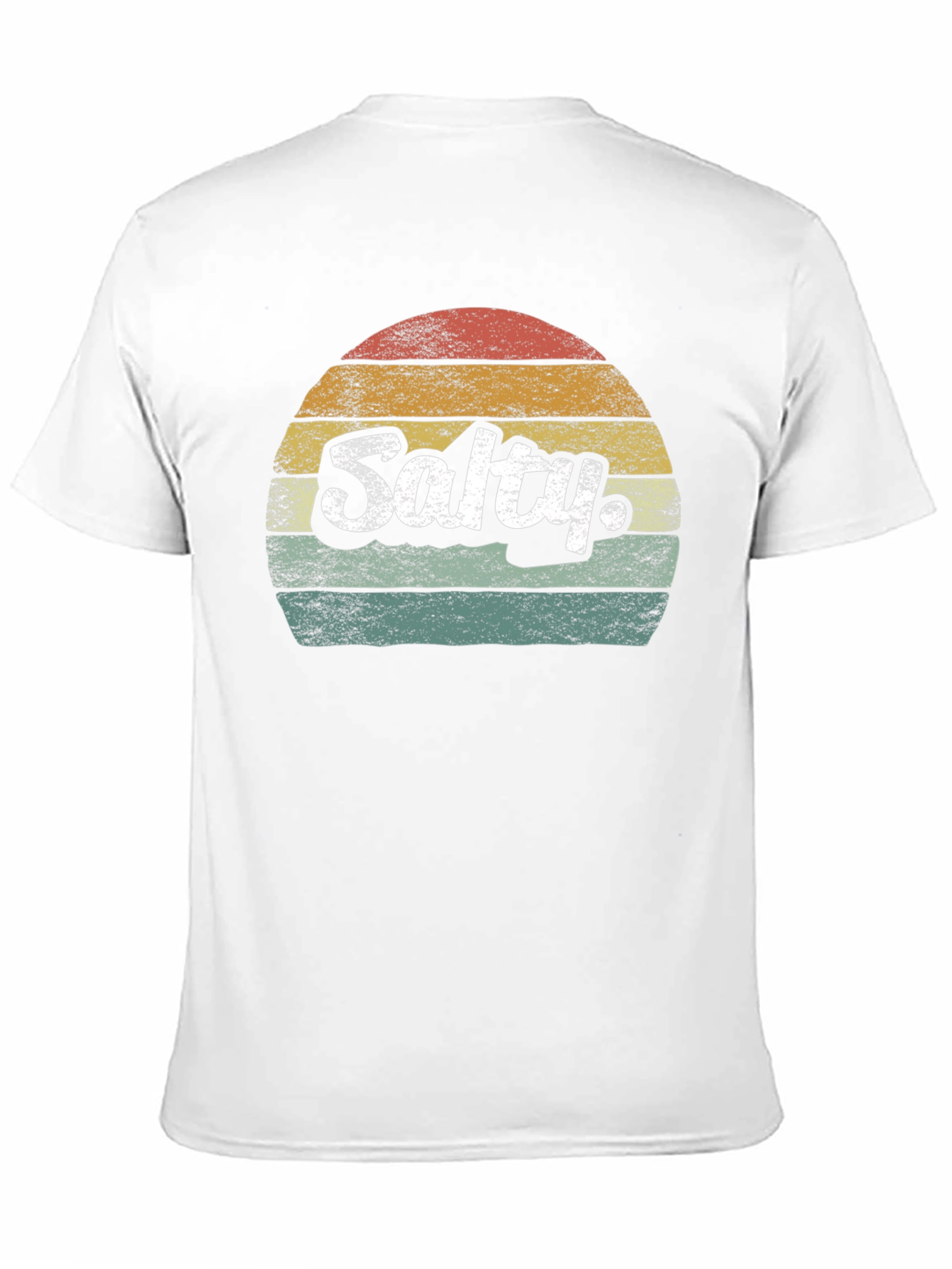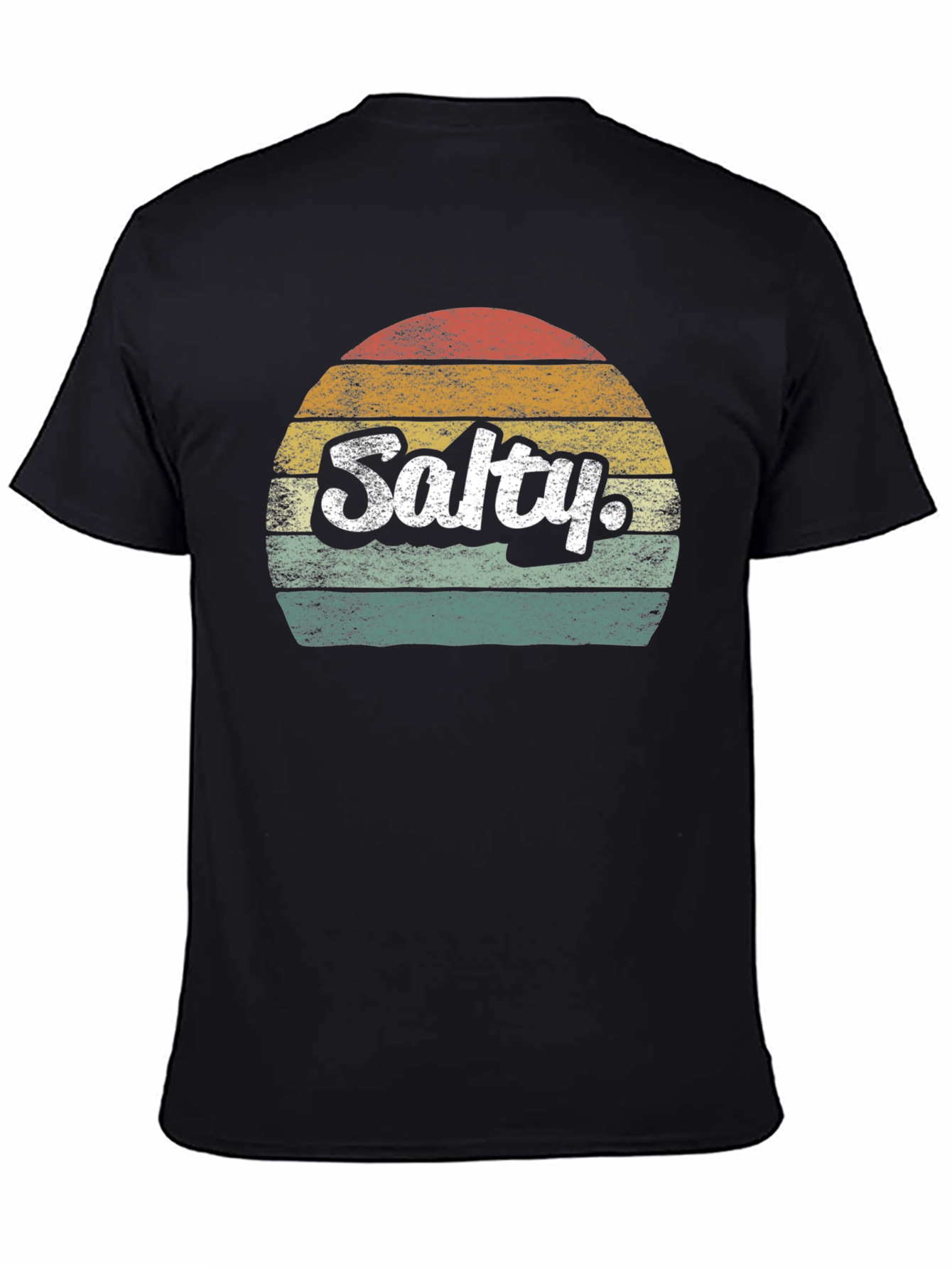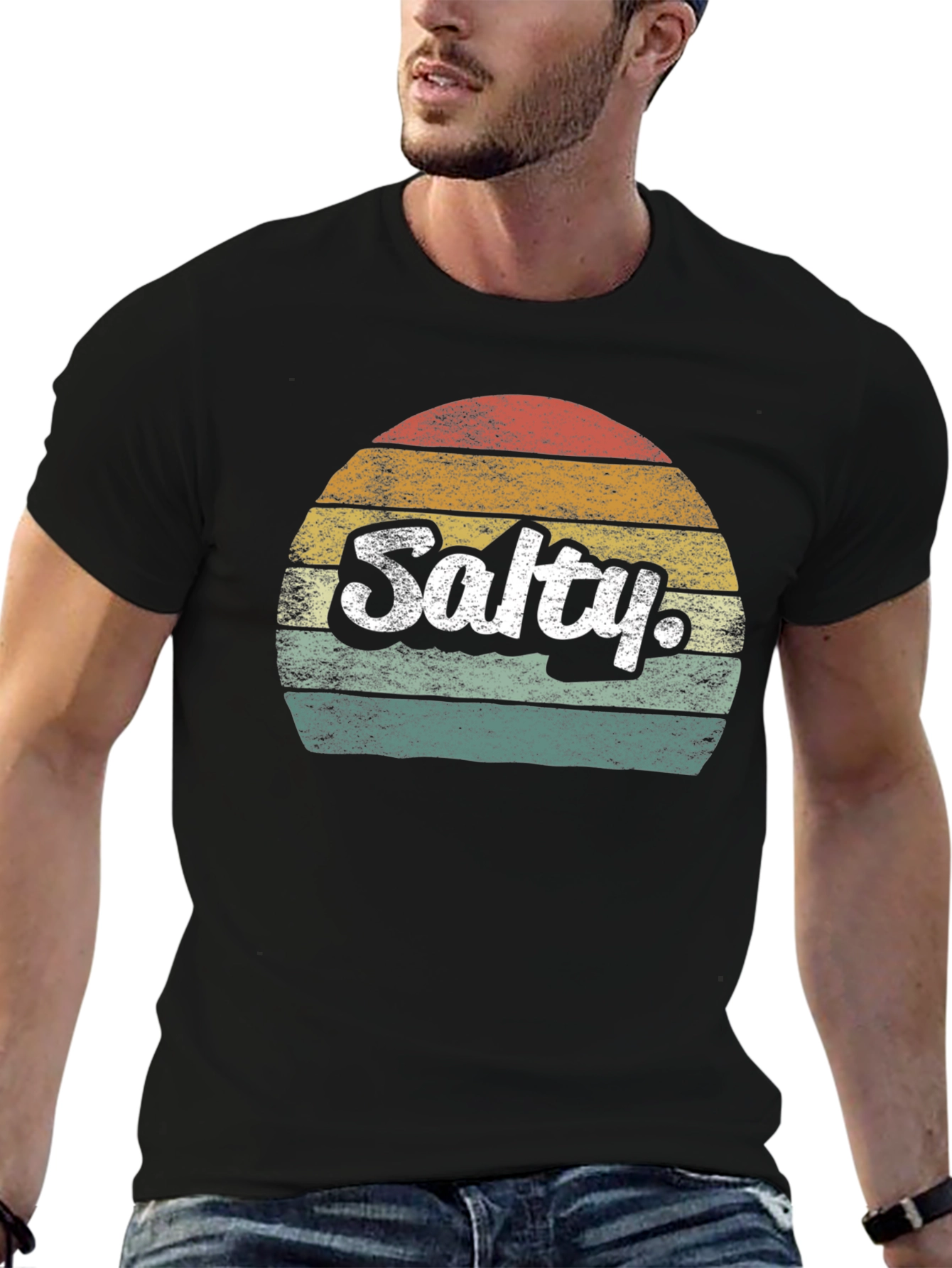Embrace a laid-back vibe with this vintage-inspired t-shirt. The design features a retro sunset graphic with the word "Salty" in a stylish, distressed font. The sunset is composed of horizontal stripes in hues of red, orange, yellow, and blue-green, creating a classic, summery aesthetic. Crafted from a soft, breathable fabric, this tee offers both comfort and style. Perfect for casual outings, beach days, or simply lounging around, this graphic tee adds a touch of retro charm to any outfit. The black color provides a versatile backdrop for the vibrant graphic, making it easy to pair with jeans, shorts, or your favorite casual bottoms. Show off your easy going attitude with this unique t-shirt!
