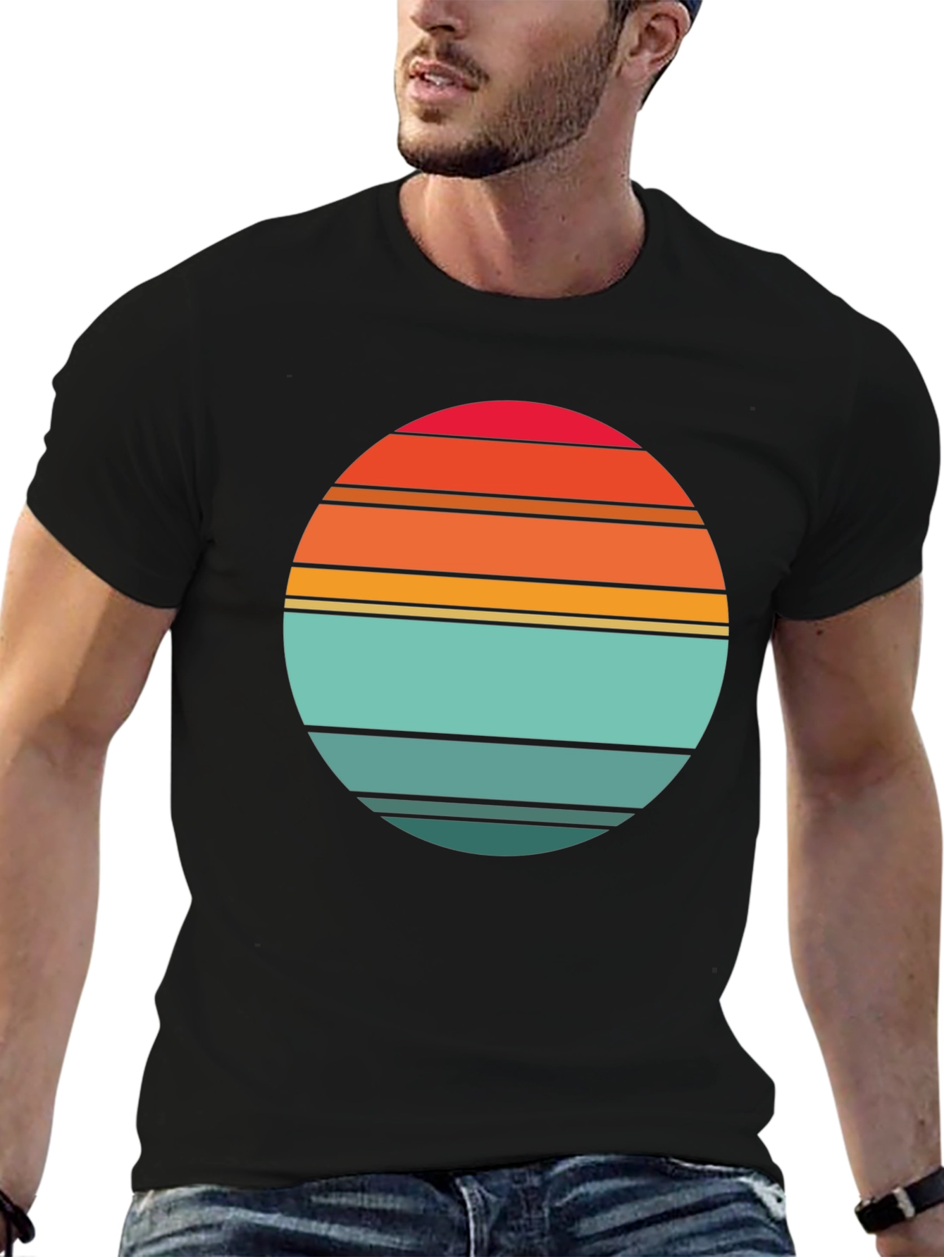 This stylish black t-shirt features a vintage-inspired sunset graphic. The design showcases a bold circle with horizontal stripes in shades of red, orange, and teal. The classic crew neck and short sleeves make it a versatile wardrobe staple. Made from a comfortable, breathable fabric, this tee is perfect for everyday wear. Ideal for casual outings, concerts, or lounging at home. Add a touch of retro flair to your outfit with this unique and eye-catching graphic tee. A comfortable and stylish addition to your collection.