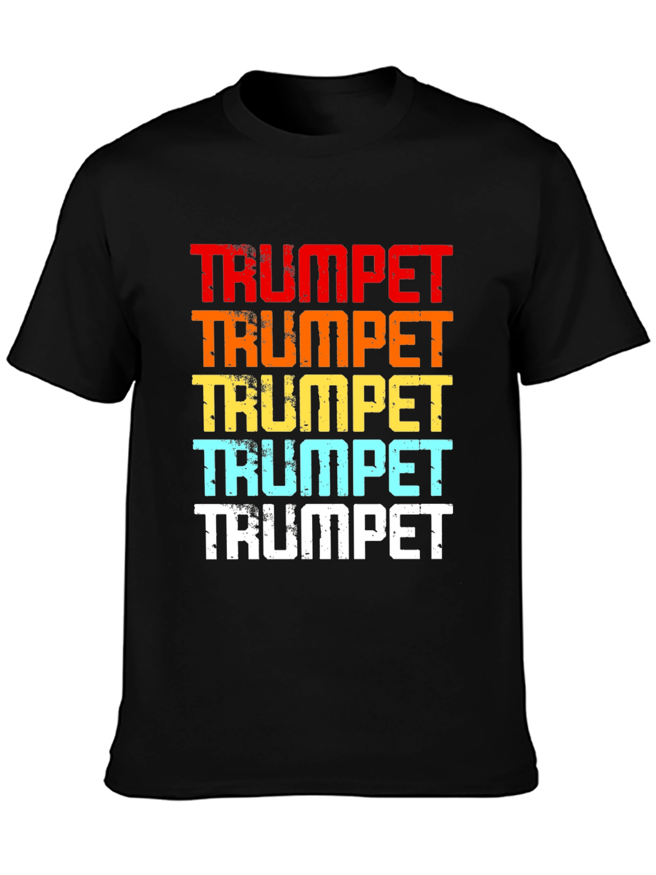 Show your love for music with this eye-catching black t-shirt! The design features the word 'TRUMPET' printed five times in a retro, stacked style. Colors graduate from red and orange to yellow, light blue, and white, offering a vintage, vibrant look. Made from what appears to be a soft, comfortable cotton blend, this tee is perfect for casual wear, music events, or showing off your passion for playing the trumpet. It's a great conversation starter and a fantastic gift for any musician!