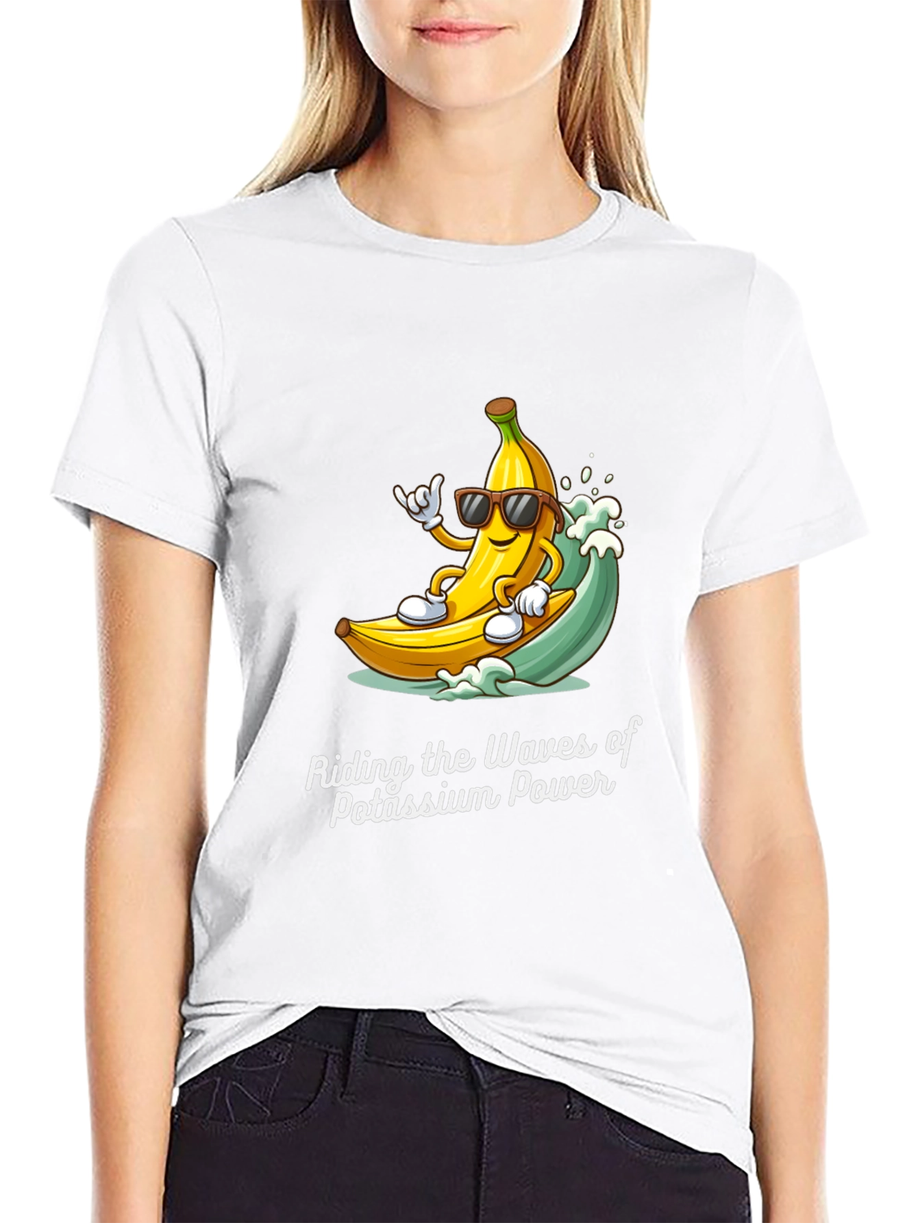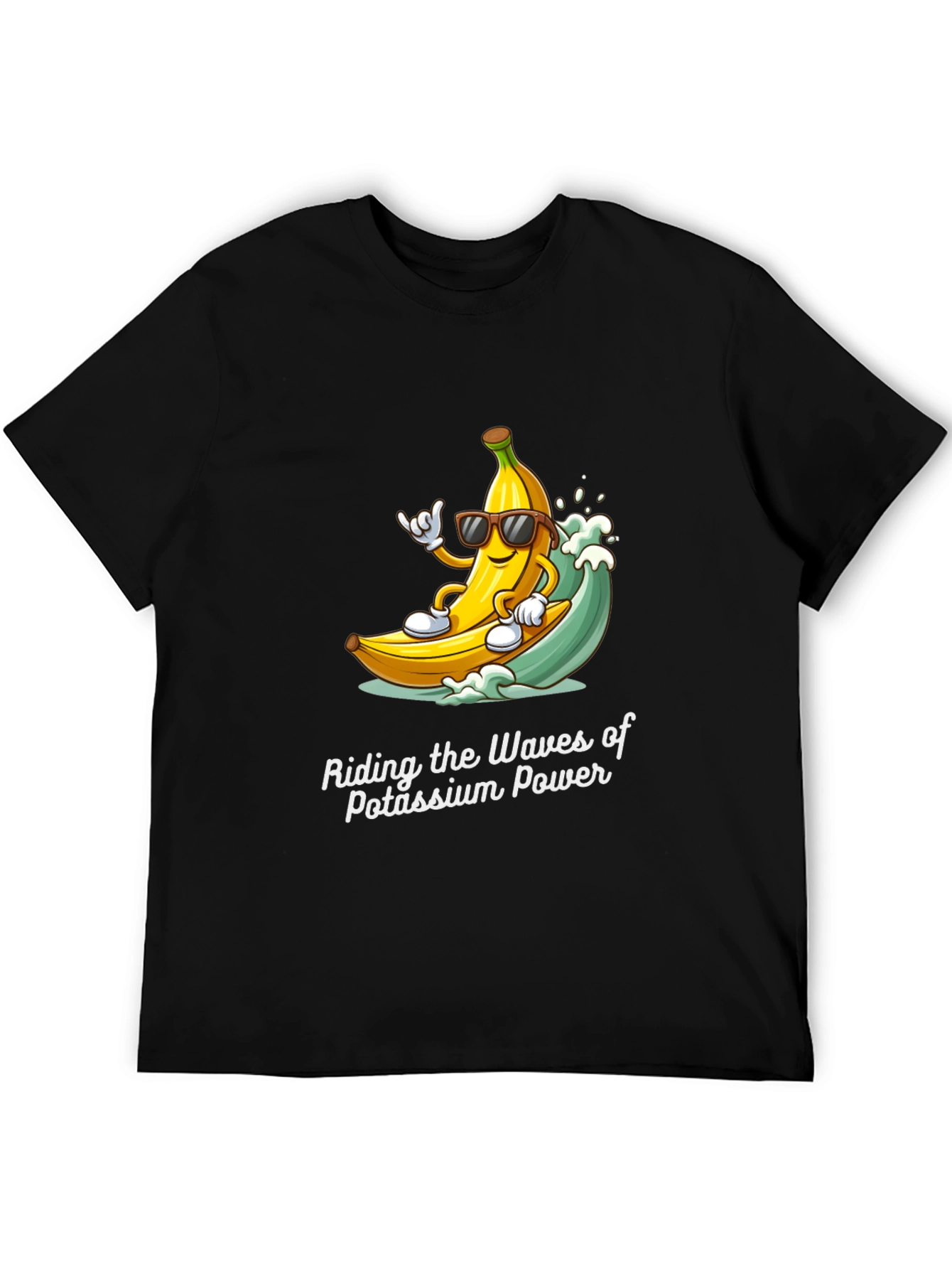 Catch the wave with this unique t-shirt! This black tee features a vibrant graphic of a cool banana character wearing sunglasses, riding a wave, and flashing the 'shaka' sign. The playful design is accompanied by the text "Riding the Waves of Potassium Power." Made from a comfortable-looking material, this shirt is perfect for adding a touch of humor and personality to your casual wardrobe. Ideal for everyday wear, beach trips, or anyone who loves a good pun. Get yours and show off your potassium power!