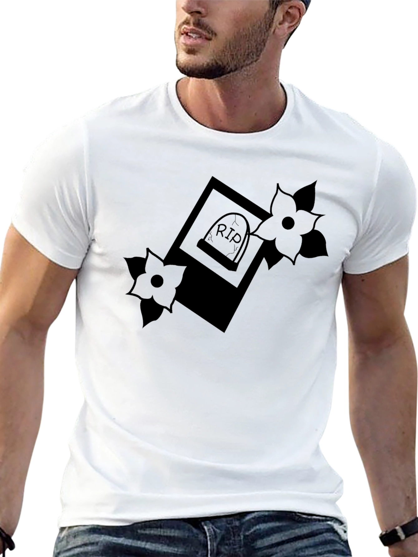 This classic black t-shirt features a bold and unique graphic design. A tombstone with "RIP" inscribed on it is framed by a square and complemented by elegant floral accents on either side. The minimalist design creates a striking visual impact, perfect for adding an edgy touch to any casual outfit. Made from a soft, comfortable fabric, this tee is ideal for everyday wear, concerts, or making a statement. Pair it with jeans or shorts for a versatile and effortlessly cool look. Show off your individuality with this eye-catching tee!