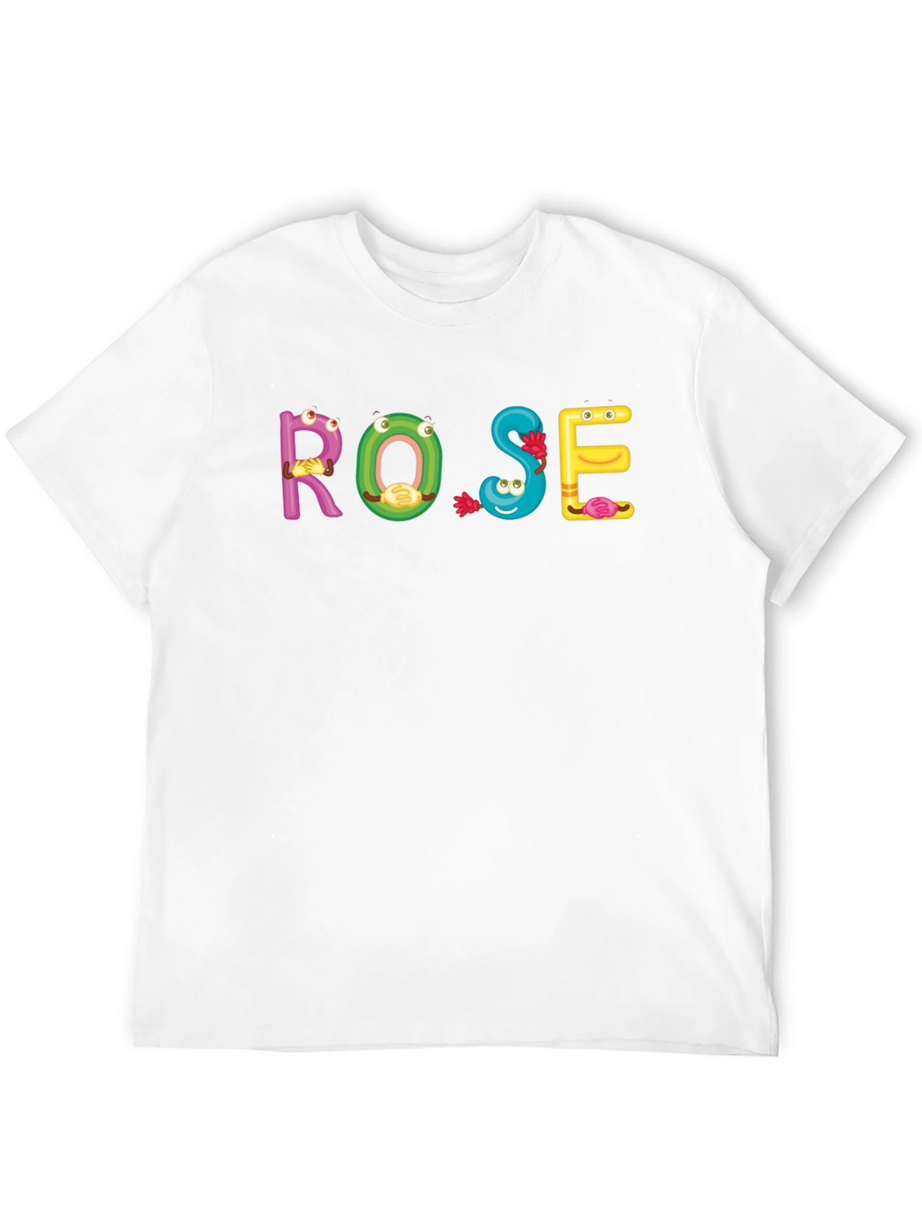 Show off your love for ROSE with this fun, eye-catching graphic t-shirt. Featuring a playful "ROSE" design crafted from colorful cartoon letters, this tee is sure to turn heads. The design features animated characters, each intricately designed. Made from soft, breathable black fabric, this shirt offers superior comfort and a flattering fit. Perfect for casual outings, themed parties, or simply expressing your unique style. A must-have addition to any ROSE enthusiast's wardrobe. Its bold design and comfortable fit make it a versatile choice for everyday wear. The t-shirt's design is both trendy and appealing. Enjoy the comfort and style of this unique tee.