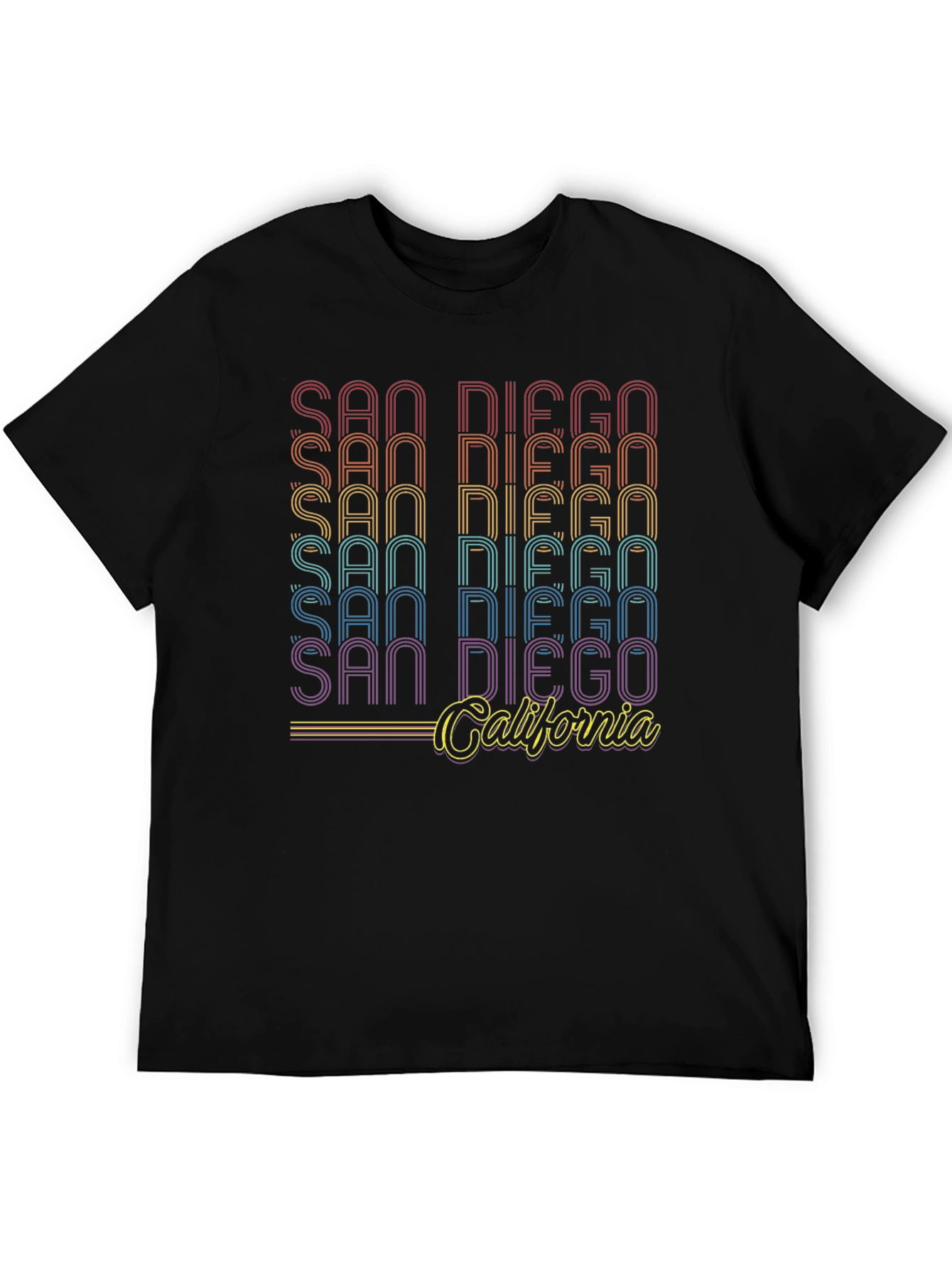 Show your love for sunny San Diego with this stylish graphic t-shirt! The shirt features a retro-inspired design with the words "San Diego" stacked in a vibrant, multi-colored gradient pattern. Below, "California" is written in a cursive font. Made from a comfortable fabric, this tee is perfect for everyday wear, whether you're exploring the city, hitting the beach, or just hanging out. Its classic fit and eye-catching graphic make it a versatile addition to any wardrobe. Get yours today and represent your favorite California city in style!