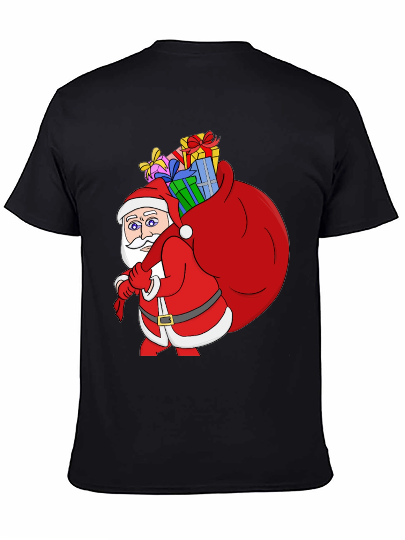 Spread holiday cheer with this eye-catching t-shirt! This black tee features a fun cartoon graphic of Santa Claus carrying a sack full of colorful Christmas presents. Perfect for Christmas parties, holiday gatherings, or simply showing off your festive spirit, this shirt is sure to be a hit. The print has a bright, saturated look. Whether you're getting ready for gift-giving or just want to add some seasonal style to your wardrobe, this tee is a great choice.