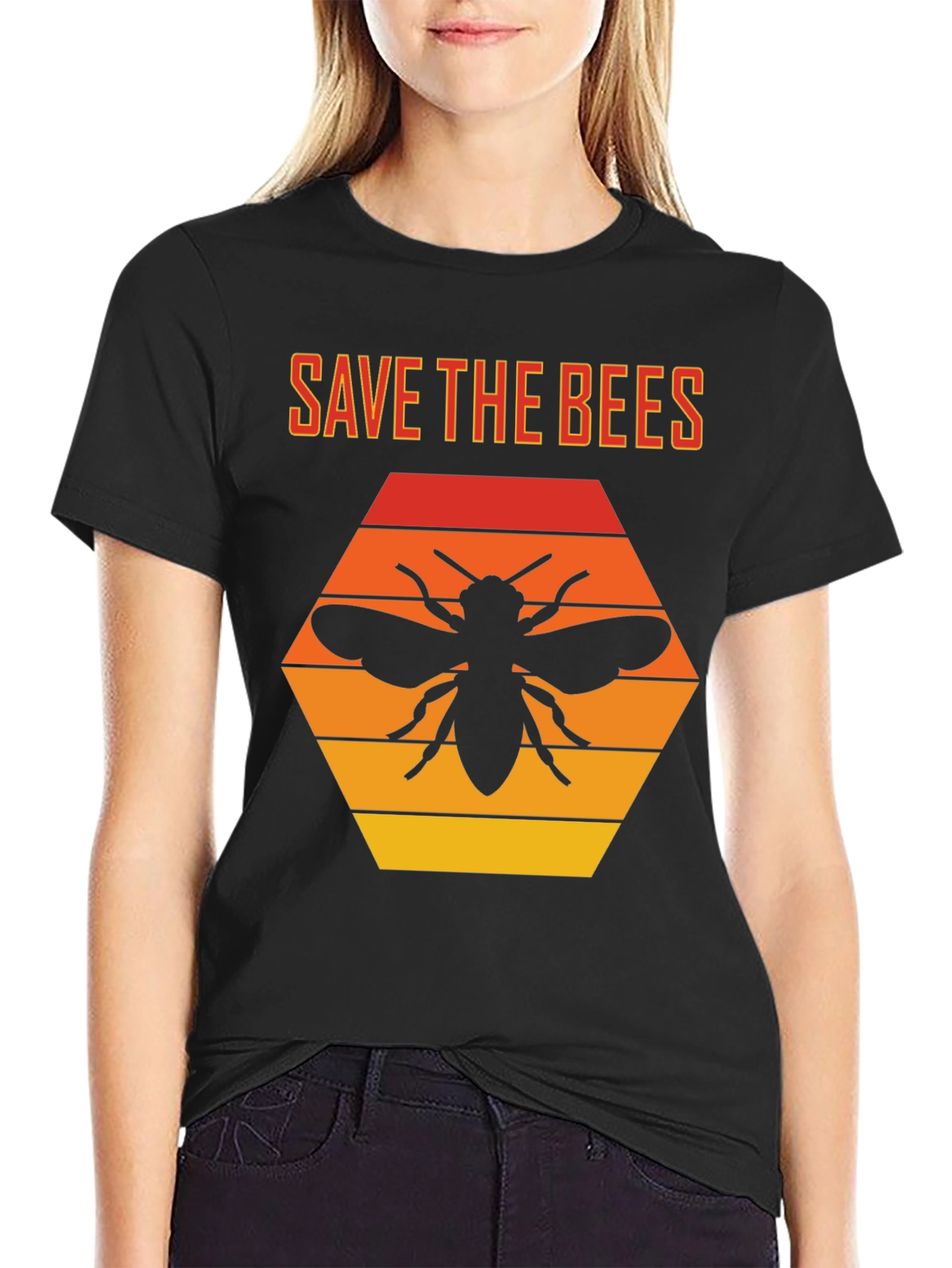 Show your support for our buzzing friends with this stylish "Save the Bees" t-shirt. The black tee features a striking graphic of a honeybee silhouette set against a vibrant, retro-style hexagon design with warm sunset colors. The text "SAVE THE BEES" is printed above the graphic in a bold, outlined font. Made from a comfortable-looking fabric, this short-sleeved shirt is perfect for everyday wear and making a statement about the importance of bee conservation. Wear it to the park, casual outings, or environmental events to spark conversations and raise awareness. A great way to support a vital cause while looking good!