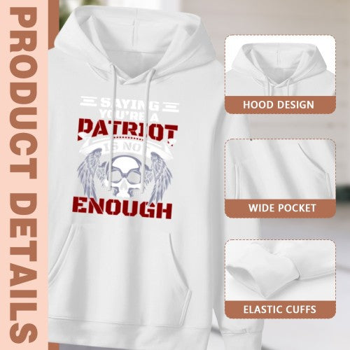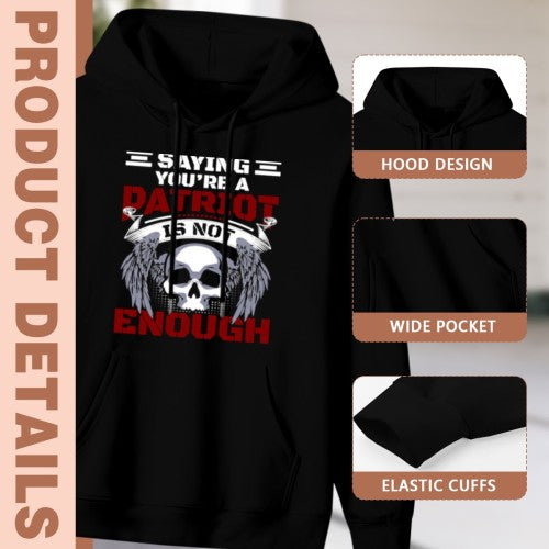 Featuring a striking "Saying You're a Patriot Is Not Enough" slogan paired with a winged skull graphic (in bold red & white detailing), this hoodie serves up raw, retro-inspired energy that’s impossible to miss. The gritty aesthetic balances attitude with wearability, making it a go-to for anyone who loves distinct, eye-catching apparel.