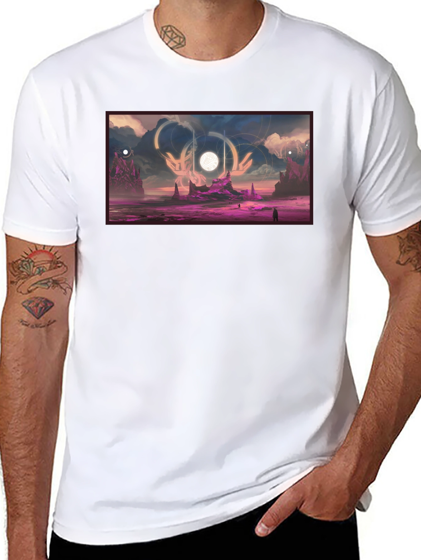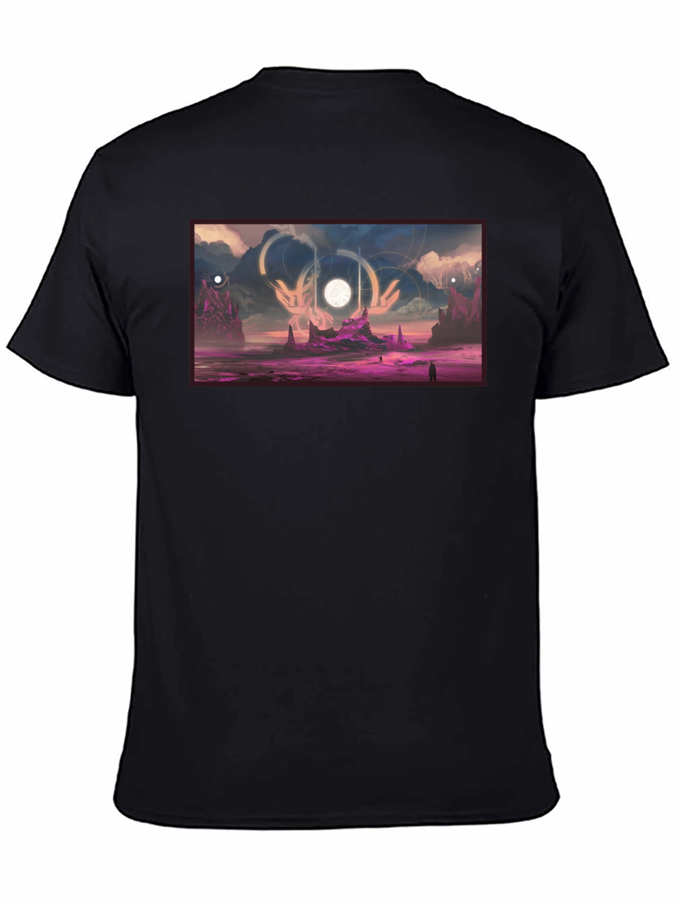 Embrace the unknown with this striking black t-shirt. Featuring a captivating rectangular graphic of a surreal, sci-fi landscape with a pink hue, towering structures, a moon-like orb, and figures in the distance, this shirt is a wearable work of art. Made from a soft, comfortable fabric, it's perfect for everyday wear or for making a statement at your next casual outing. Pair it with jeans or shorts for a unique, eye-catching look that showcases your individuality and love for the extraordinary.