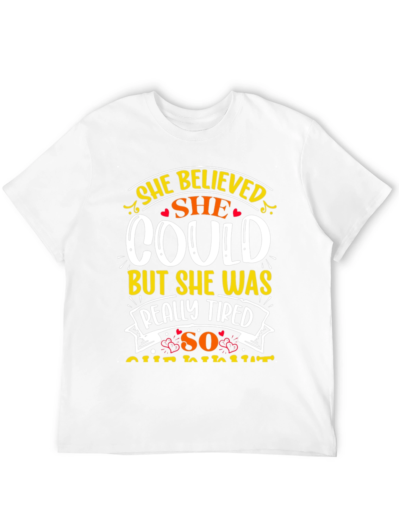 This black tee features a humorous quote, "She Believed She Could But She Was Really Tired So She Didn't", making it a fun and relatable choice for women. The graphic is printed in vibrant colors on a soft fabric. Ideal for casual wear, lounging at home, or as a quirky gift for the special women in your life. Its relaxed fit ensures all-day comfort. This Tee combines style and comfort effortlessly. Perfect for everyday wear, running errands, or just showing off your unique style. Grab yours today!