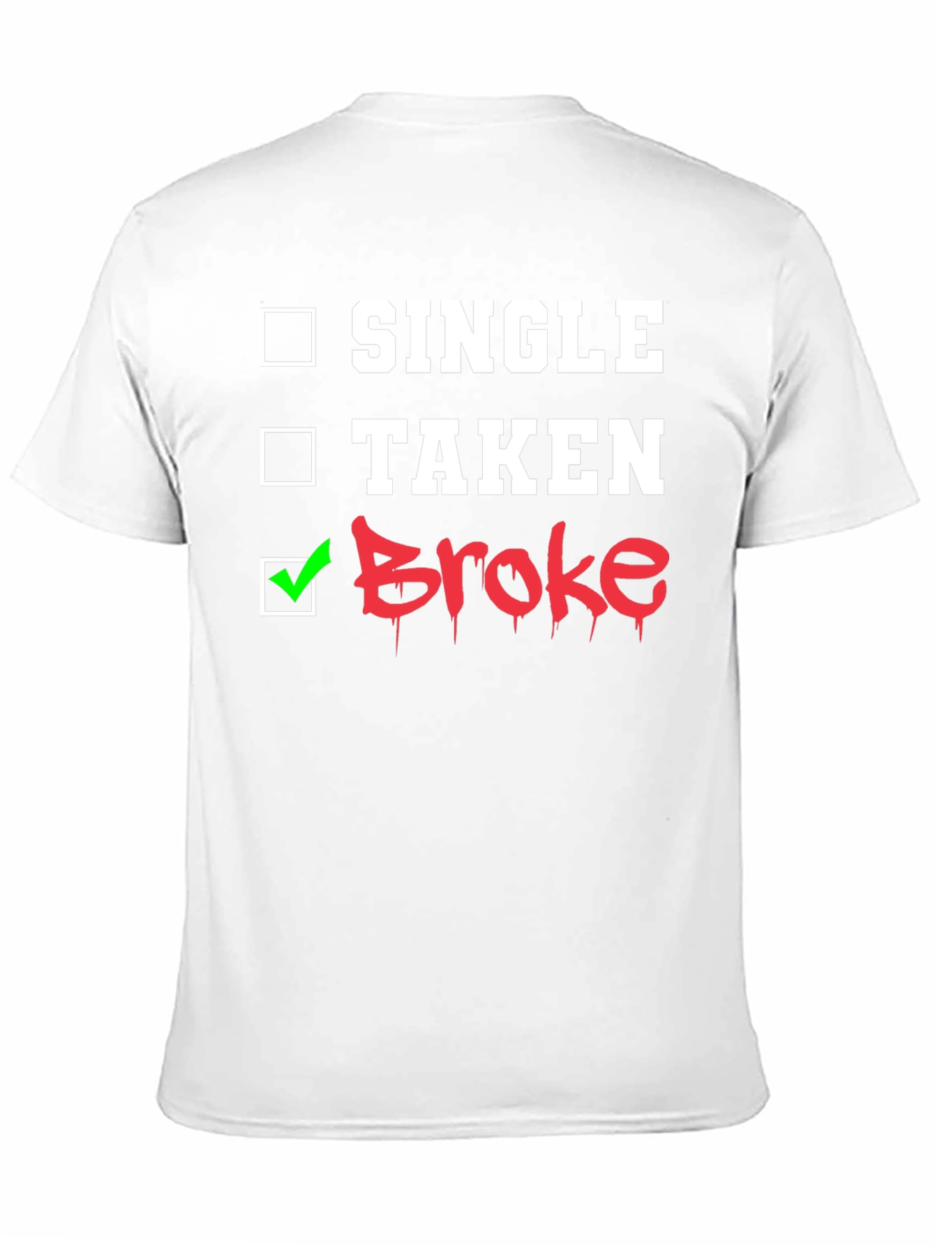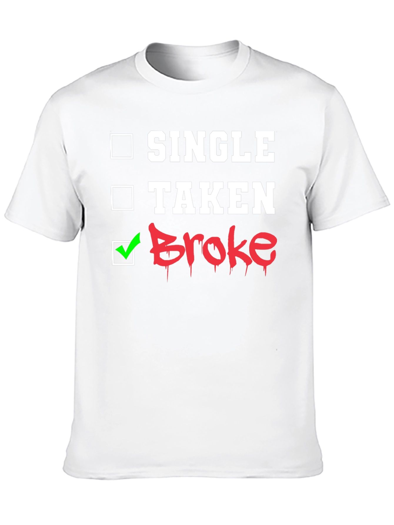 Declare your status with this humorous graphic t-shirt. This black tee features the words "Single", "Taken", and "Broke" with check boxes next to each. A green check mark highlights the "Broke" option in a playful statement. Crafted from a soft, comfortable fabric, this tee is perfect for casual wear. Show off your sense of humor with this eye-catching t-shirt, ideal for everyday outings, social gatherings, or as a fun gift for friends and family. Comfortable and stylish, this shirt is sure to turn heads and spark conversation. Express yourself with this unique and relatable graphic tee.