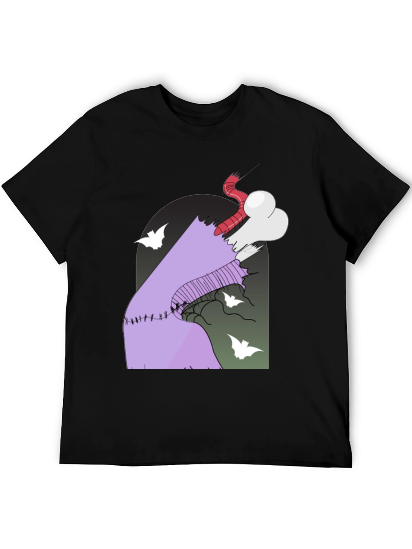 Embrace the spirit of Halloween with this eye-catching graphic tee. Featuring a unique cartoon design with purple torn cloth, a bone, and playful bat accents, this t-shirt adds a touch of whimsy to your spooky style. Made from comfortable, breathable cotton, it’s perfect for casual wear, Halloween parties, or themed events. Stand out from the crowd and showcase your love for all things Halloween with this standout graphic tee. Get yours today!