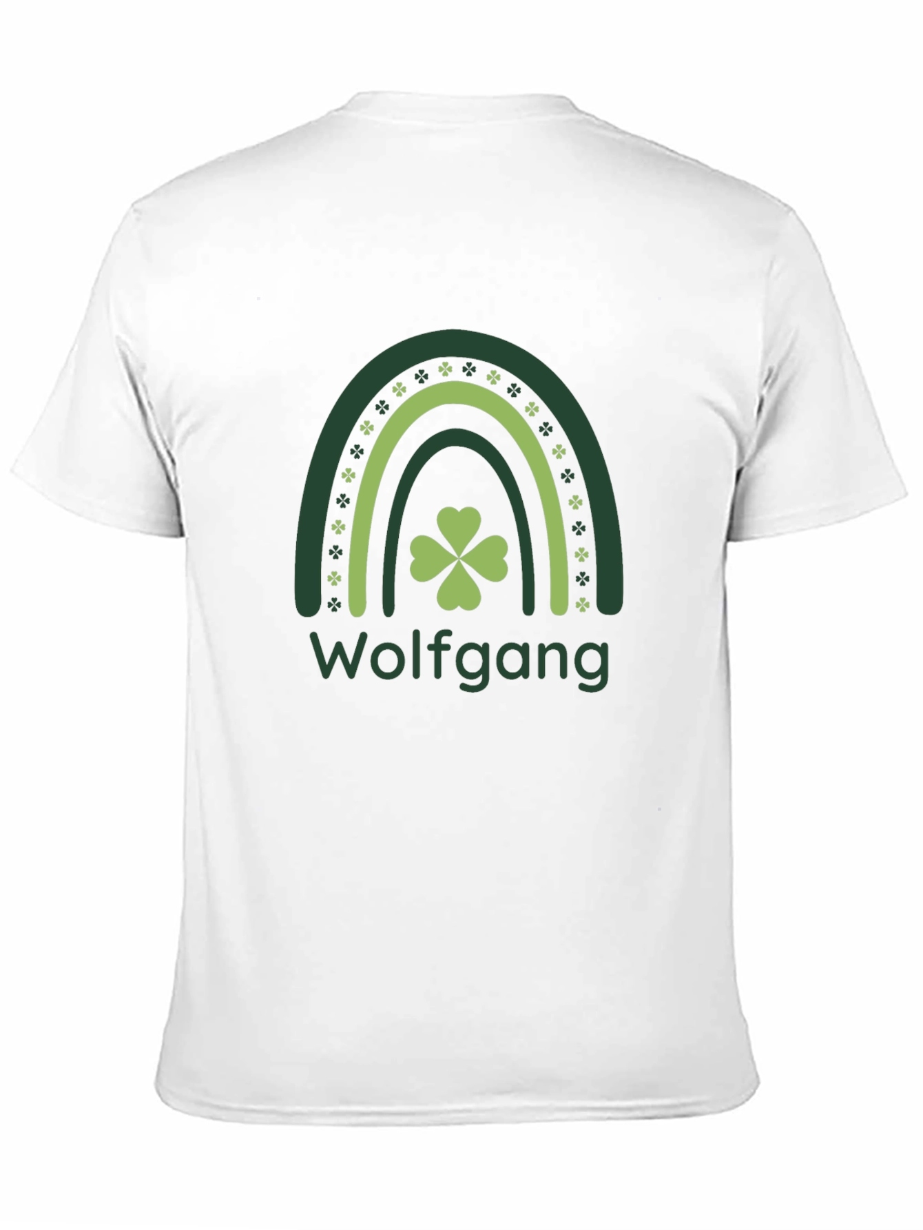 Celebrate St. Patrick's Day in style with this eye-catching black t-shirt! This unique tee features a charming green rainbow design, adorned with clover accents, and personalized with the name "Wolfgang" in matching green lettering. The playful design is perfect for adding a festive touch to your wardrobe. Made from comfortable, breathable fabric, this shirt is ideal for St. Patrick's Day parties, parades, or casual everyday wear. Show off your Irish spirit or give this personalized shirt as a fun gift! Get yours today and spread the luck of the Irish!