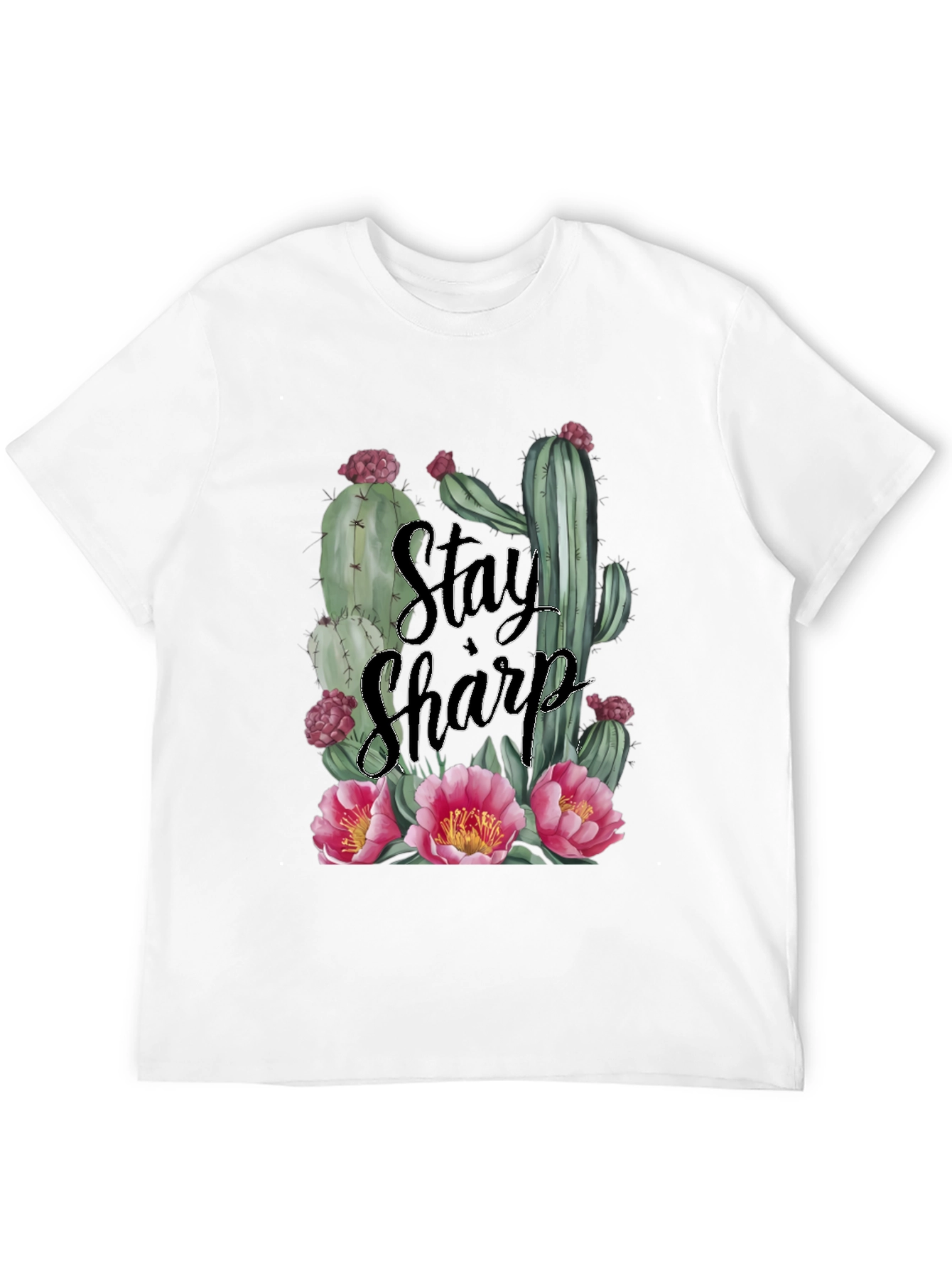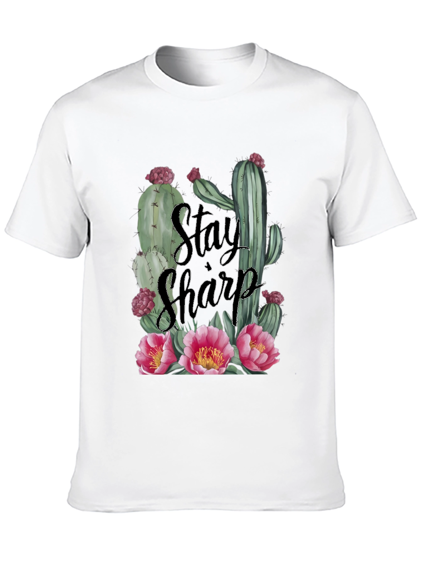 Show off your love for desert vibes with this cool cactus graphic tee! This black t-shirt features a vibrant illustration of cacti with blooming pink flowers, accompanied by the stylish "Stay Sharp" script. Made from soft, breathable fabric, this shirt offers all-day comfort and a relaxed fit. It's a perfect casual wear for everyday style. Express your unique style with this eye-catching t-shirt, ideal for garden lovers, nature enthusiasts, or anyone who loves a touch of quirky fashion. Pair it with jeans or shorts for a trendy look.