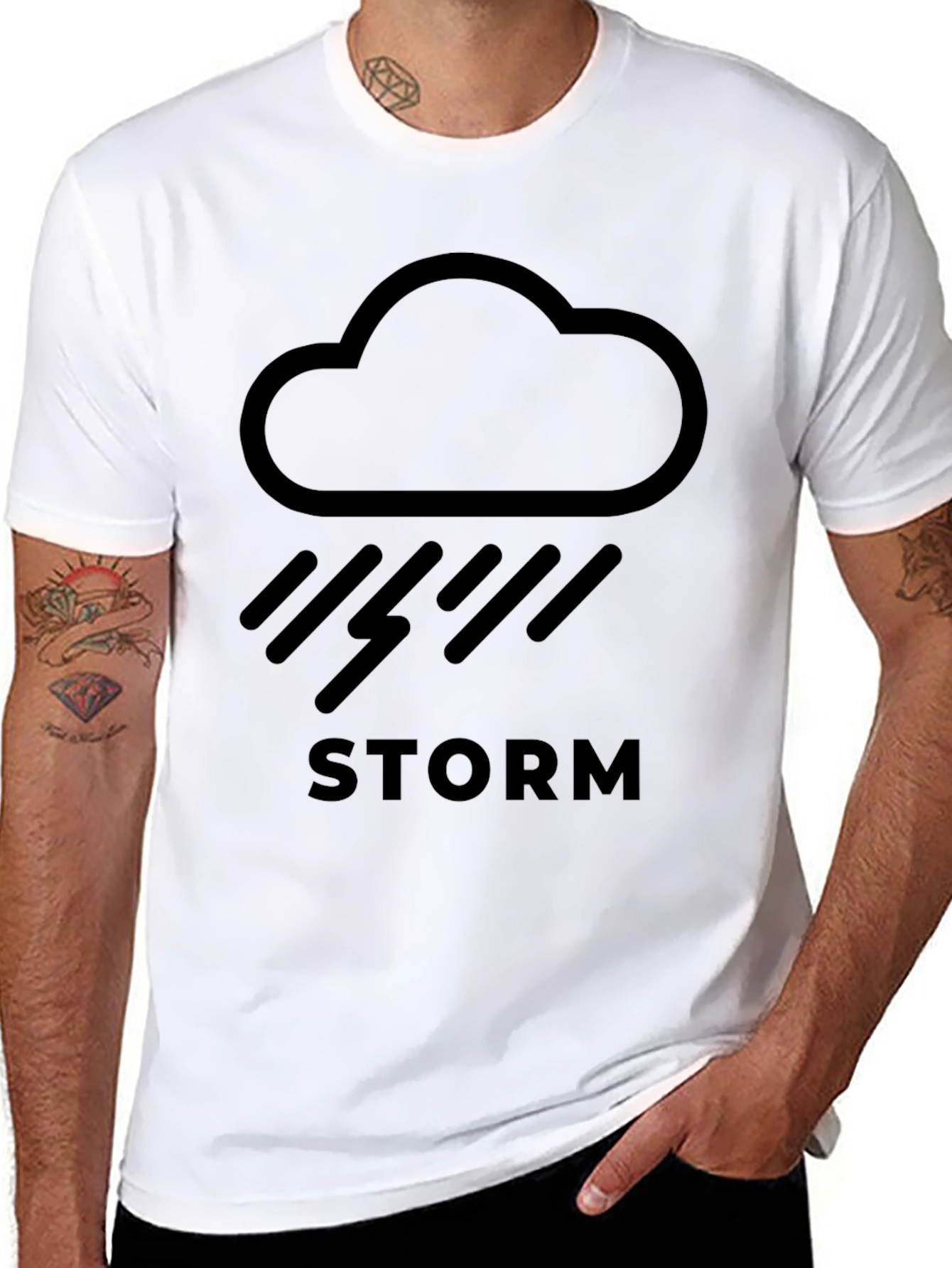 Embrace the elements with this stylish black graphic t-shirt. The design features a bold, minimalist storm cloud with rain and a lightning bolt, accompanied by the word "STORM" underneath. Crafted from a soft and comfortable fabric, this tee offers a relaxed fit perfect for everyday wear. This shirt is an excellent conversation starter and an ideal choice for casual outings, weather enthusiasts, or anyone looking to add an edgy yet simple design to their wardrobe. Pair it with jeans, shorts, or joggers for a laid-back look. Show off your love for stormy weather with this unique and eye-catching t-shirt!