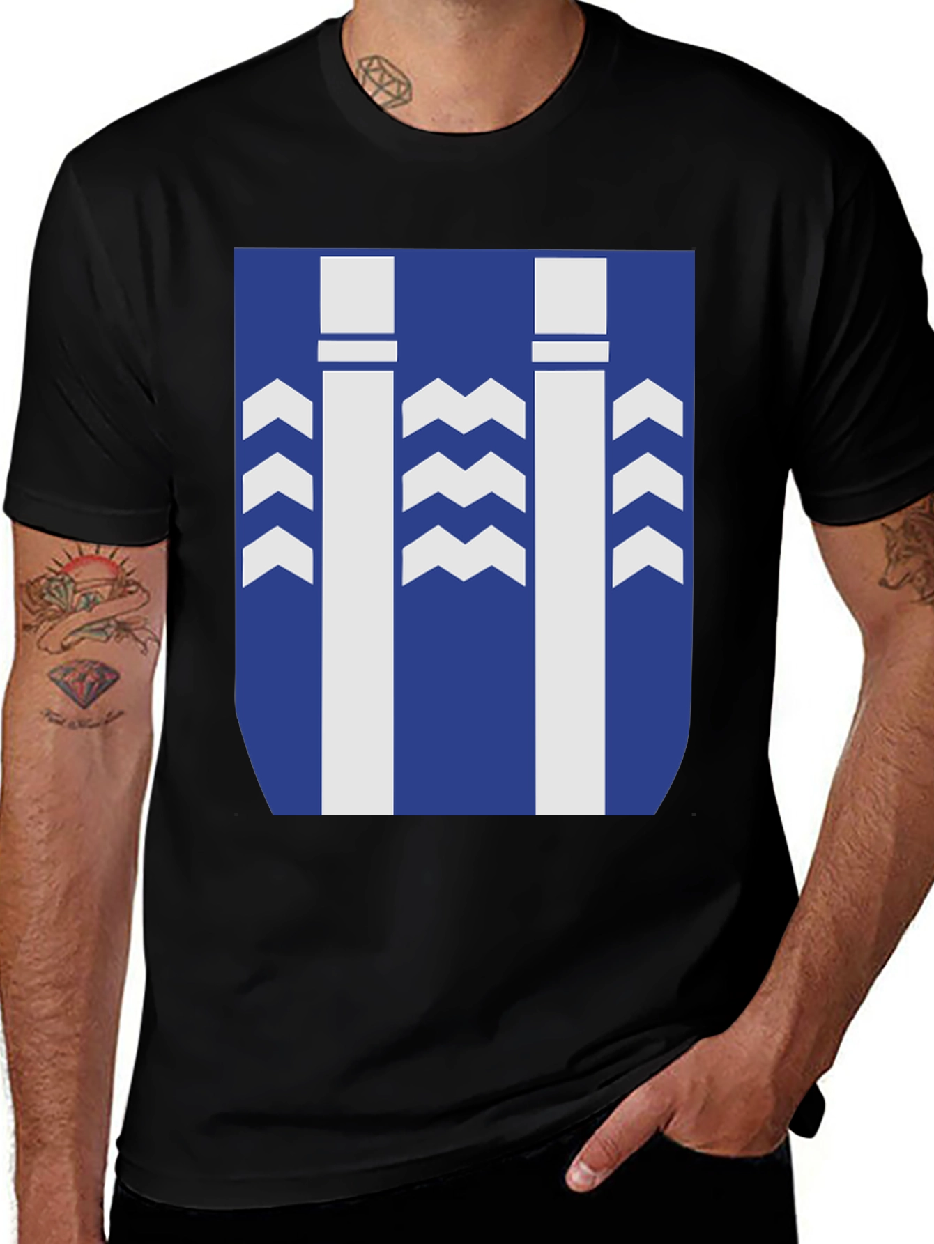 Show off your unique style with this eye-catching graphic tee! This t-shirt features a bold blue backdrop with striking white geometric designs. The classic short-sleeve cut and comfortable fit make it perfect for everyday wear. The design is modern and versatile, allowing you to pair it with jeans, shorts, or casual pants. This tee is sure to turn heads and make a statement wherever you go. Ideal for casual outings, concerts, or just lounging around, this graphic tee is a must-have addition to your wardrobe. Upgrade your closet with this trendy and comfortable piece!