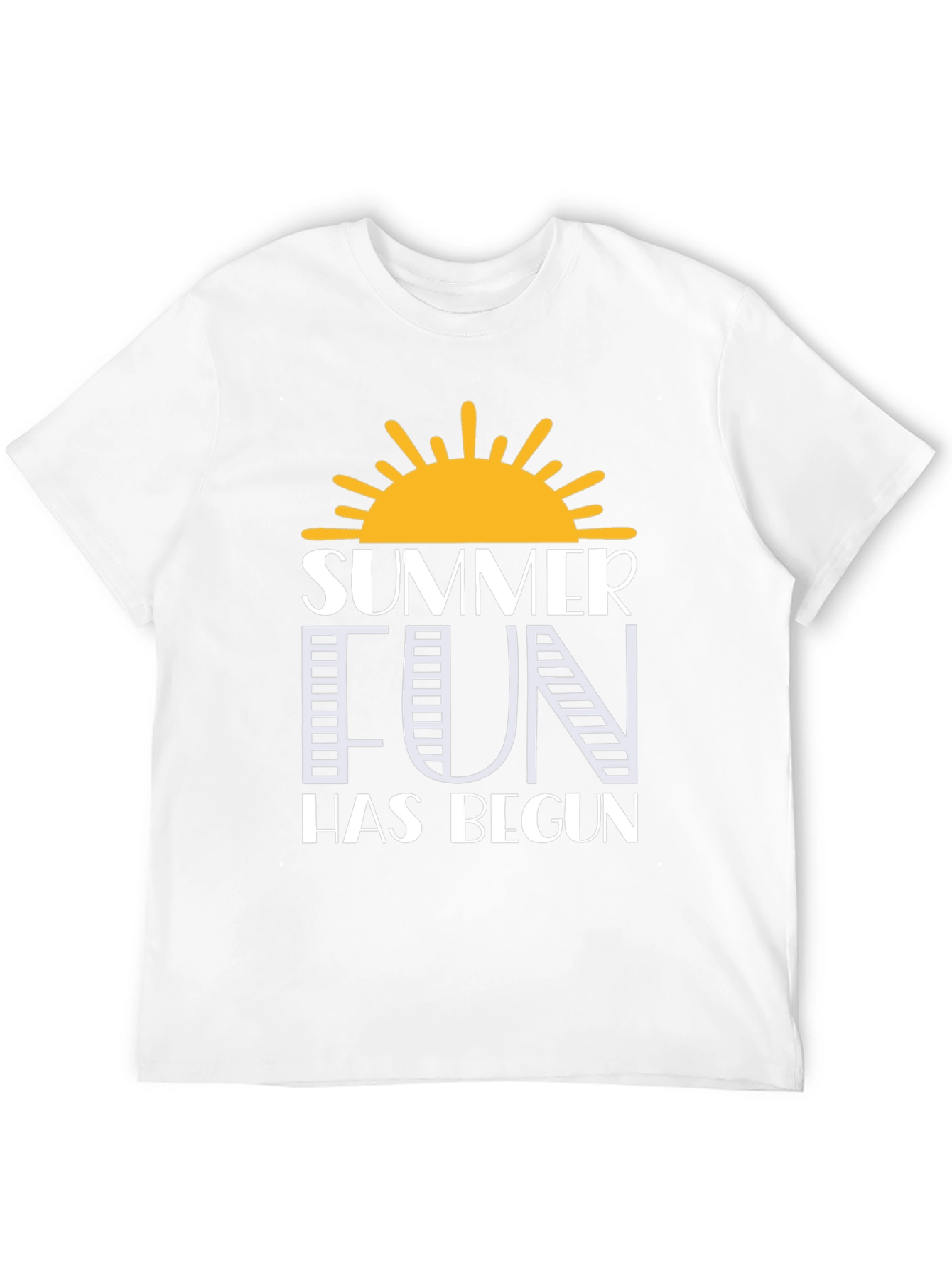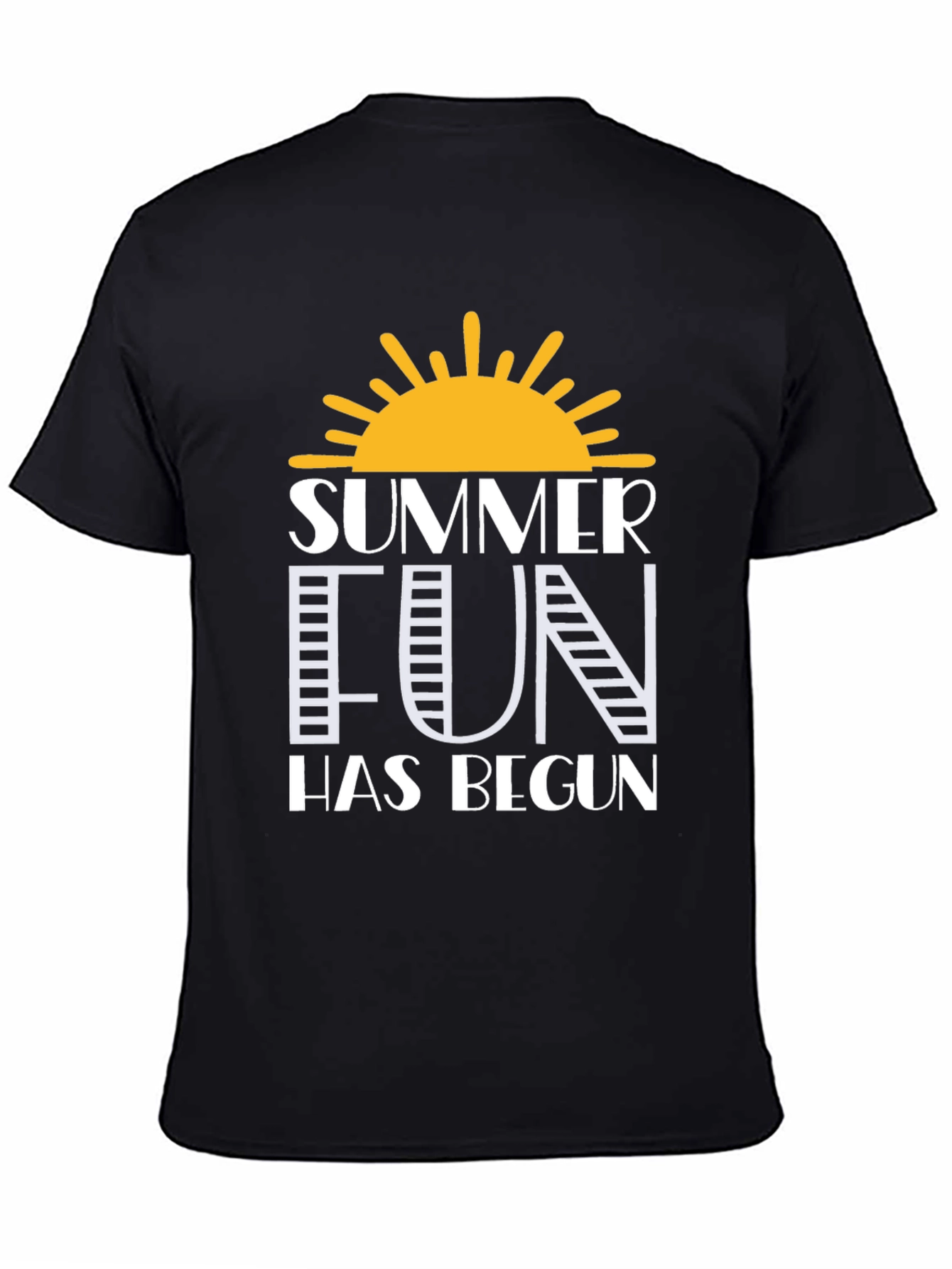 Embrace the summer vibes with this stylish black t-shirt! Featuring a vibrant yellow sun graphic above the words "SUMMER FUN HAS BEGUN", this tee is perfect for warm weather adventures. The bold white lettering of "FUN" is uniquely designed with eye-catching horizontal lines, making it a standout piece. Made from comfortable cotton, this shirt is ideal for casual outings, beach trips, or backyard barbecues. Show off your sunny spirit and let everyone know the summer fun has officially started! Great for everyday wear.