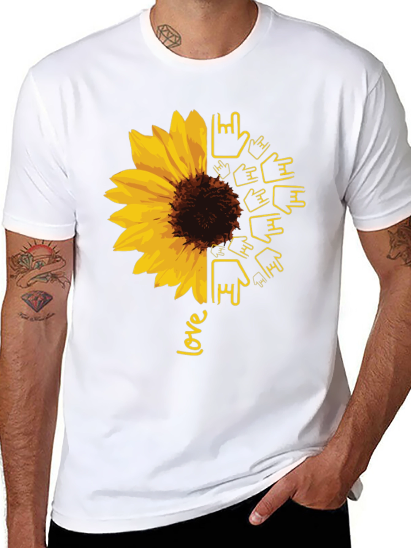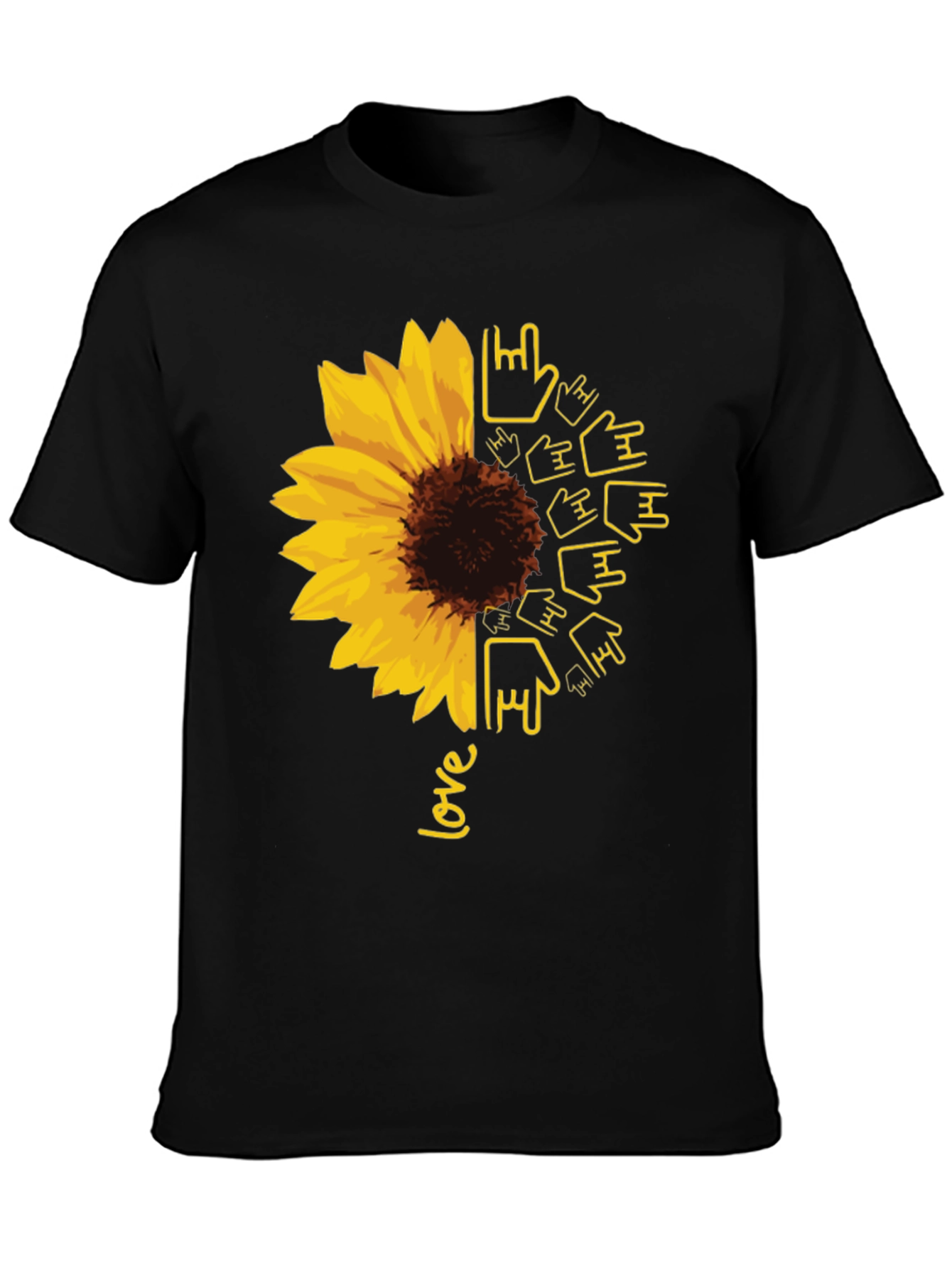 Show your love with this unique graphic t-shirt. The black tee features a vibrant half sunflower design combined with the American Sign Language (ASL) sign for 'I love you' repeated to form a matching half circle. The word 'love' is also written in cursive below the flower. This eye-catching design is perfect for anyone who appreciates sunflowers or is passionate about sign language. Made from comfortable materials, this t-shirt is suitable for everyday wear and casual occasions. Express yourself in style with this meaningful and fashionable tee.