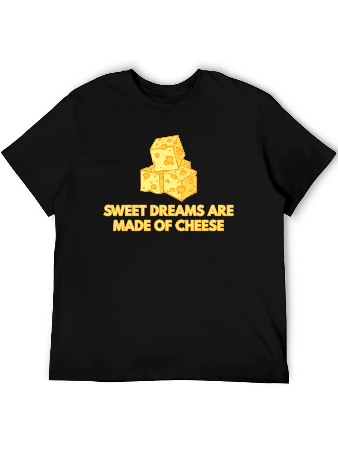 This classic black tee is a fun, playful statement piece. The shirt features a stack of cartoon-style cheese cubes with holes. Below the cheese, the phrase "SWEET DREAMS ARE MADE OF CHEESE" is printed in bold, yellow letters. The design has a lighthearted, humorous feel. Made from what appears to be a soft, comfortable cotton blend, this t-shirt is perfect for casual wear, cheese lovers, or anyone who appreciates a witty graphic tee. It's sure to spark conversation and bring a smile to anyone's face. Add a touch of cheesy fun to your wardrobe!