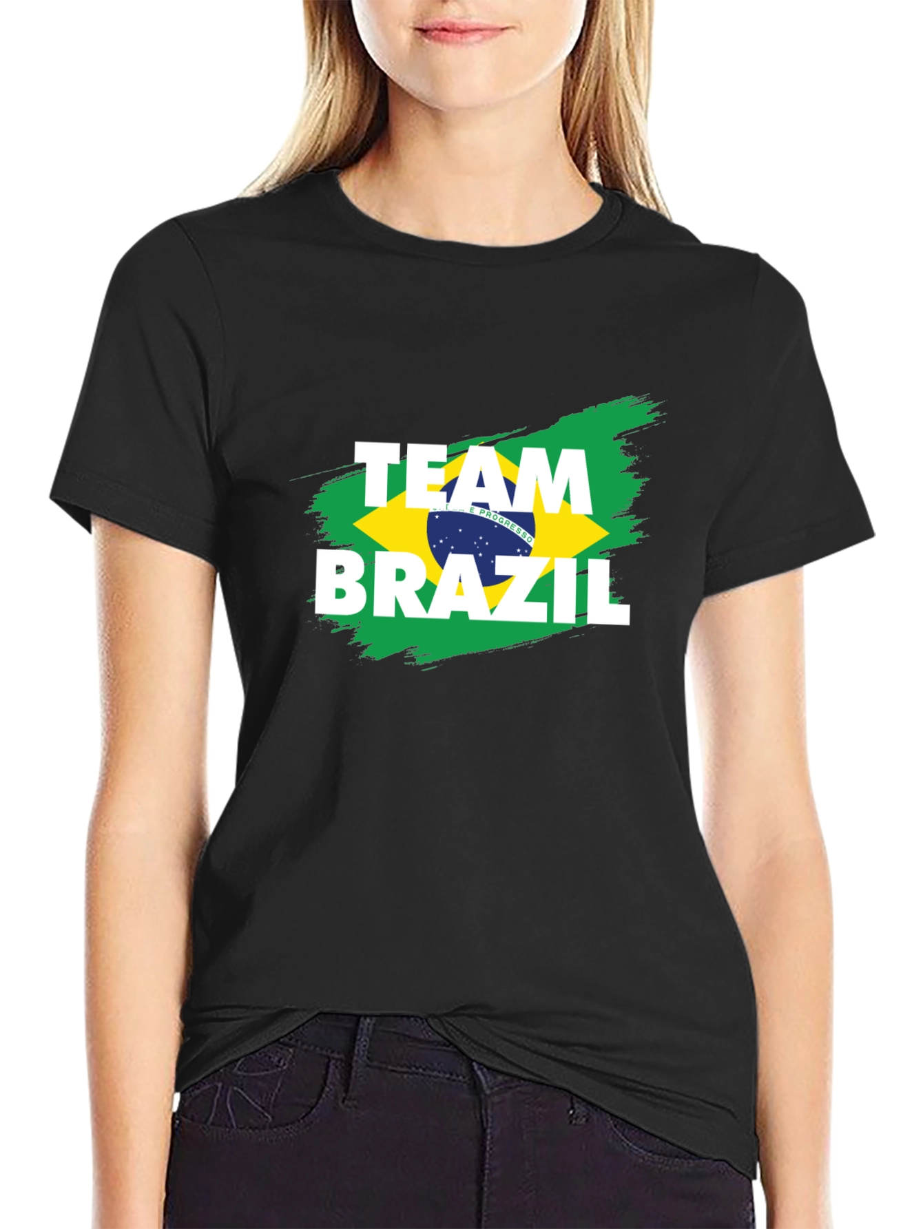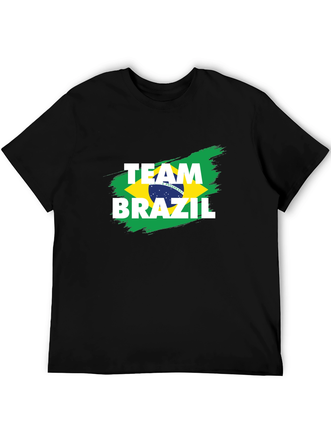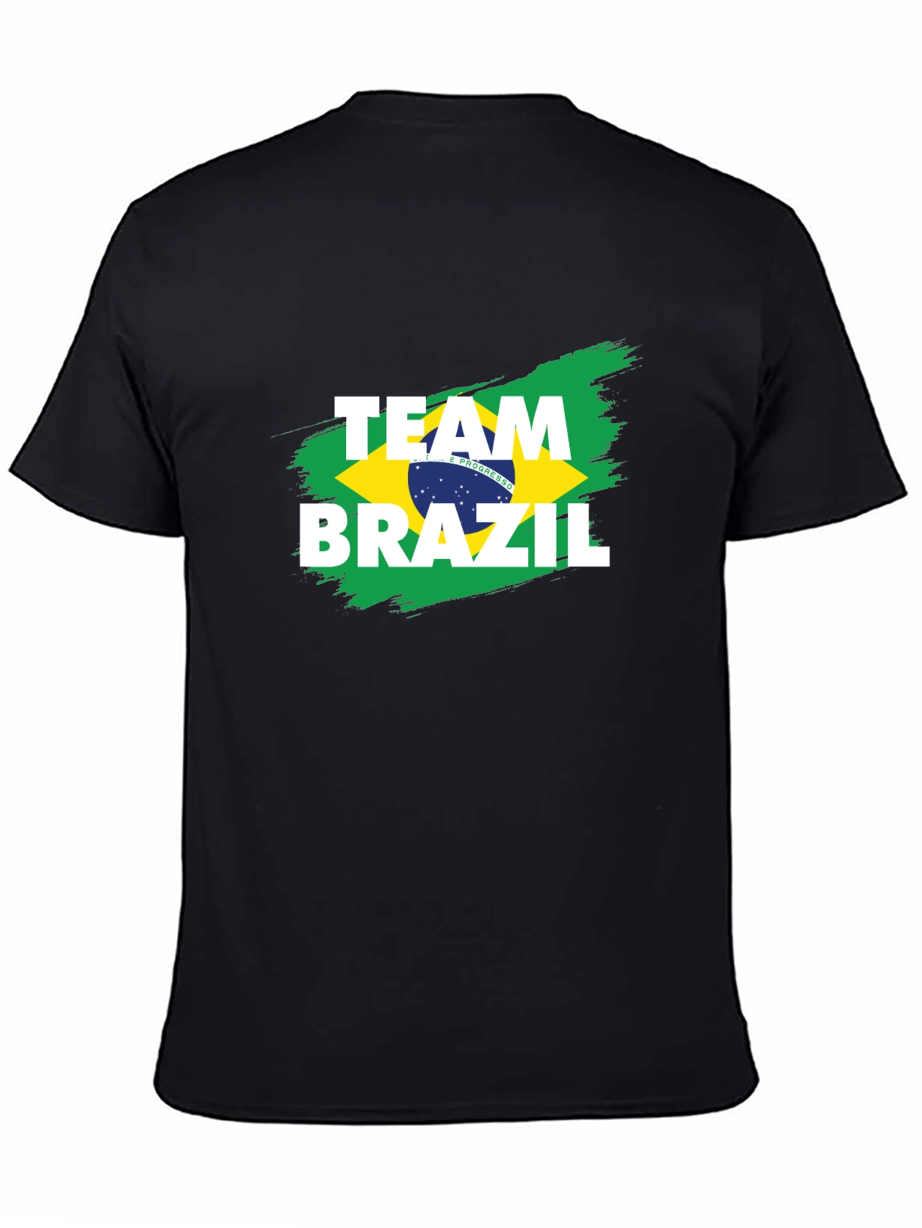 Show your support for Team Brazil with this stylish black t-shirt. Made from comfortable cotton fabric, this tee features a bold graphic design incorporating the colors of the Brazilian flag along with "TEAM BRAZIL" emblazoned across the front. The vibrant green, yellow and blue design pops against the black background. Perfect for game days, casual wear, or showing your national pride. This classic fit t-shirt is sure to make a statement. Wear it to the stadium, a watch party, or simply around town to display your love for Brazil. A must-have for any Brazil fan's wardrobe!