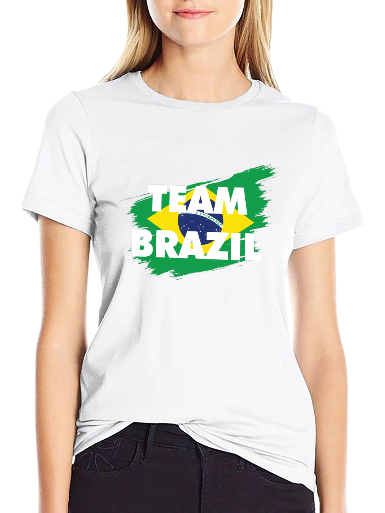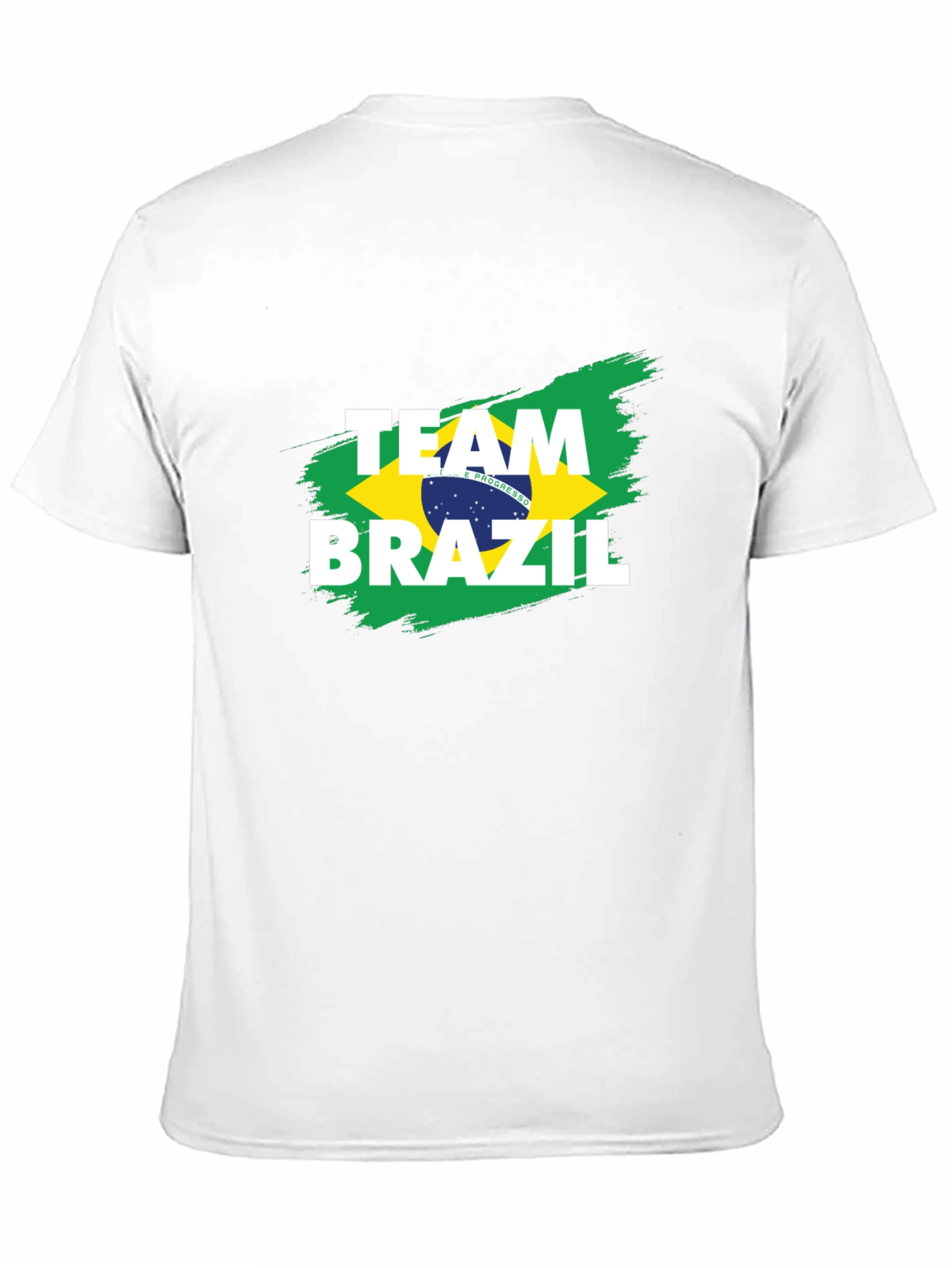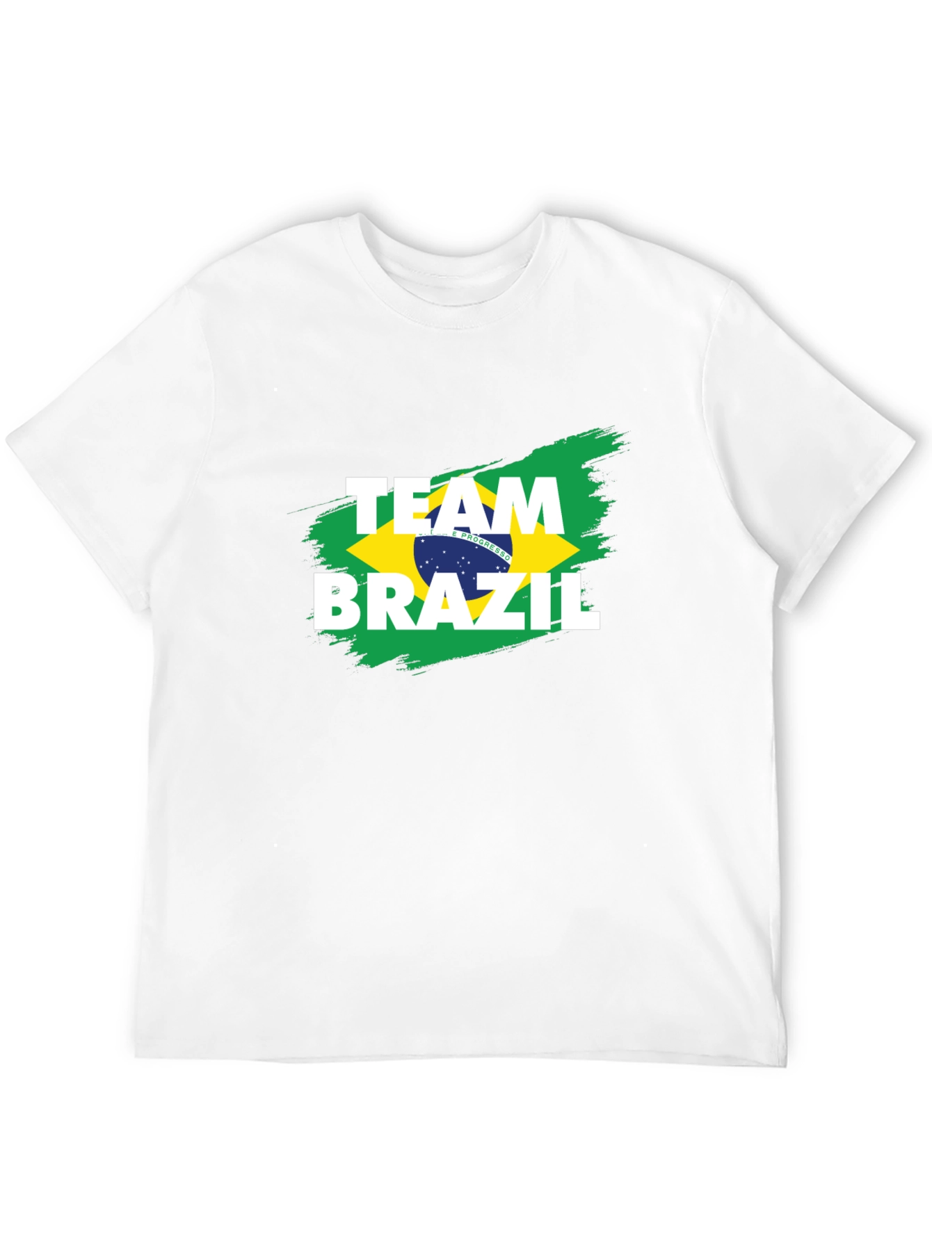 Show your support for Team Brazil with this stylish black t-shirt. Made from comfortable cotton fabric, this tee features a bold graphic design incorporating the colors of the Brazilian flag along with "TEAM BRAZIL" emblazoned across the front. The vibrant green, yellow and blue design pops against the black background. Perfect for game days, casual wear, or showing your national pride. This classic fit t-shirt is sure to make a statement. Wear it to the stadium, a watch party, or simply around town to display your love for Brazil. A must-have for any Brazil fan's wardrobe!