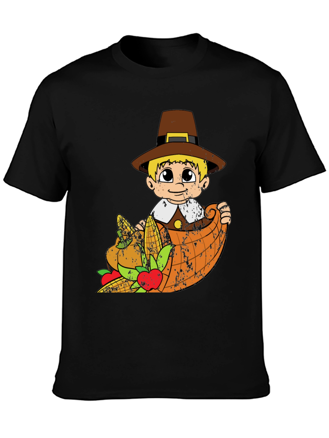 Celebrate Thanksgiving with this festive t-shirt featuring a charming pilgrim boy and a bountiful cornucopia. The design showcases a cute, cartoon-style boy in a traditional pilgrim hat nestled within a cornucopia overflowing with autumn harvest staples such as corn, apples, and pumpkins. The graphic has a slightly distressed, vintage look, adding to its charm. Made from comfortable material, this black t-shirt is perfect for Thanksgiving gatherings, family dinners, or casual fall outings. Show your holiday spirit with this eye-catching and unique design, sure to bring smiles and start conversations! It's a wonderful way to express your gratitude and appreciation for the season.