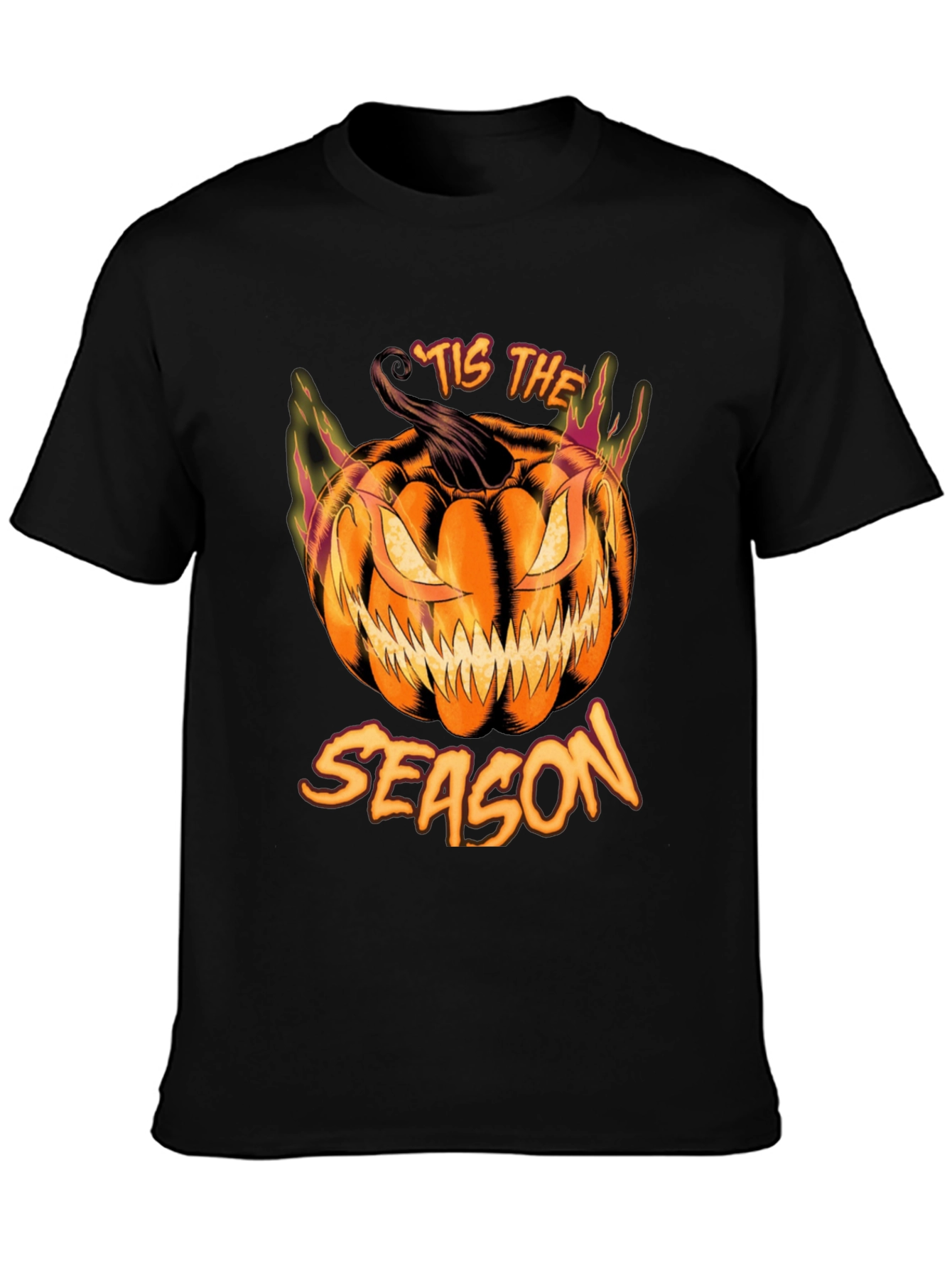 Get ready for spooky season with this Halloween-themed t-shirt. The shirt features a menacing jack-o'-lantern with sharp teeth and glowing eyes, encircled by flames. Above the pumpkin reads “Tis The”, and beneath it reads “Season” in bold, fiery lettering. This black t-shirt is perfect for Halloween parties, trick-or-treating, or showing off your love for the holiday. Made from a comfortable, breathable fabric, this shirt ensures a great fit and lasting wear. Stand out this Halloween with this unique and eye-catching design. It is sure to be a conversation starter!